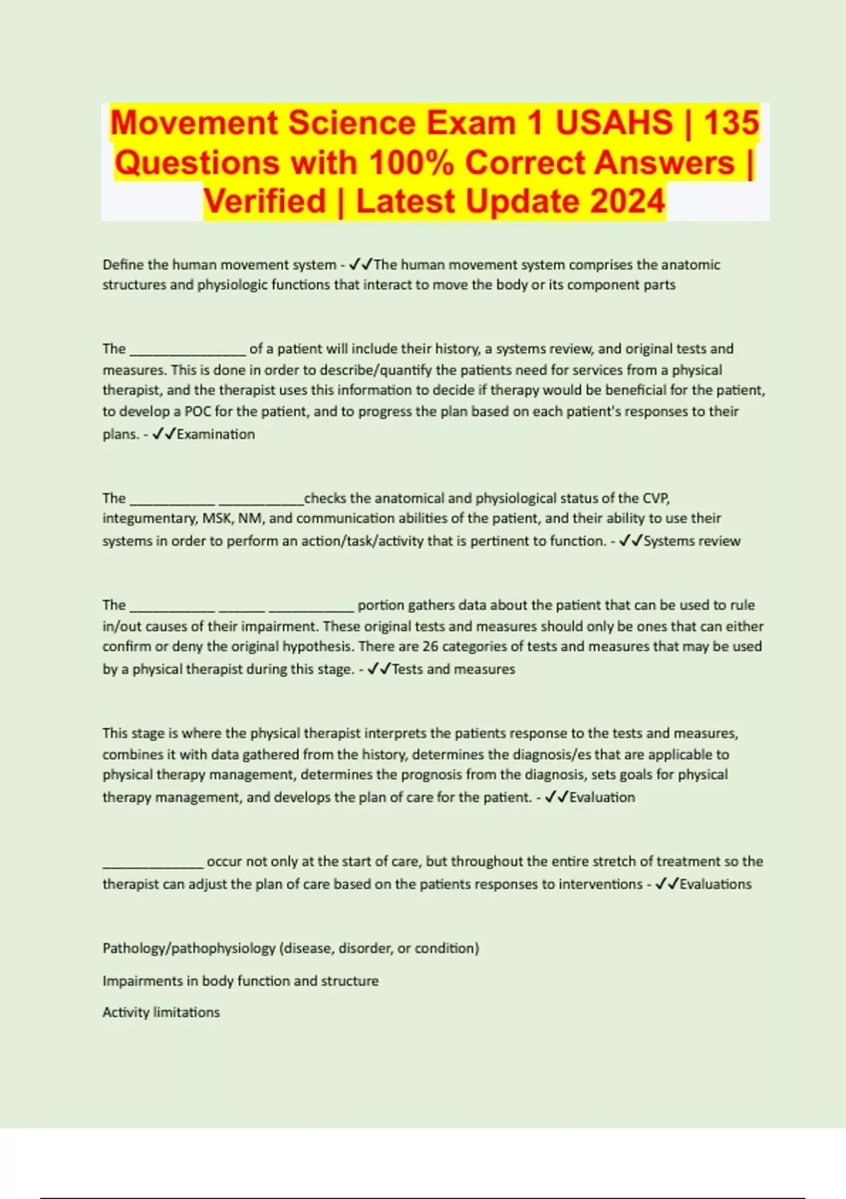 Movement Science Bundled Exams with Complete Solution | Verified | Guaranteed Success