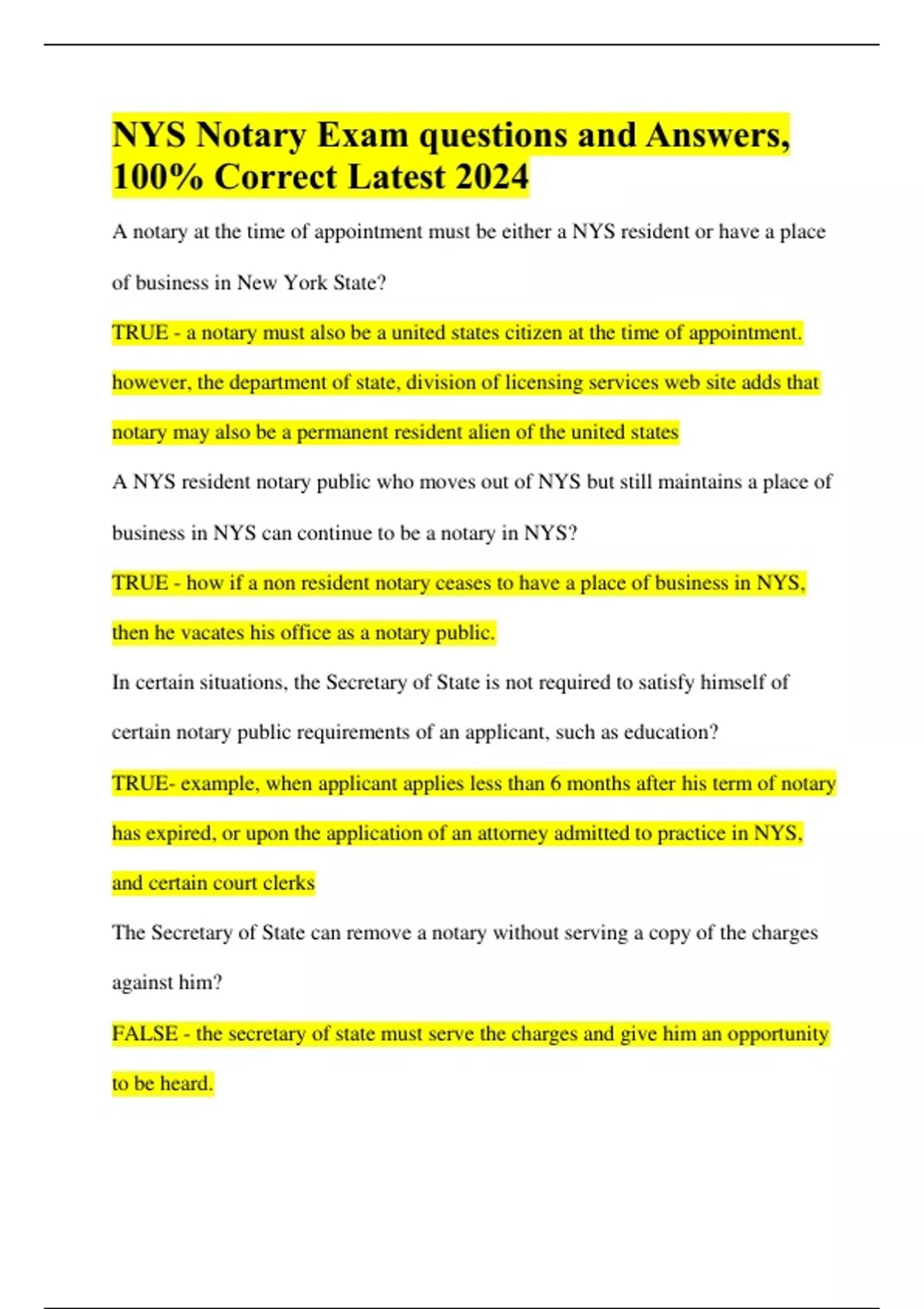 NYS Notary Exam Study guide Complete Questions and Answers 100% Correct| Latest 2024