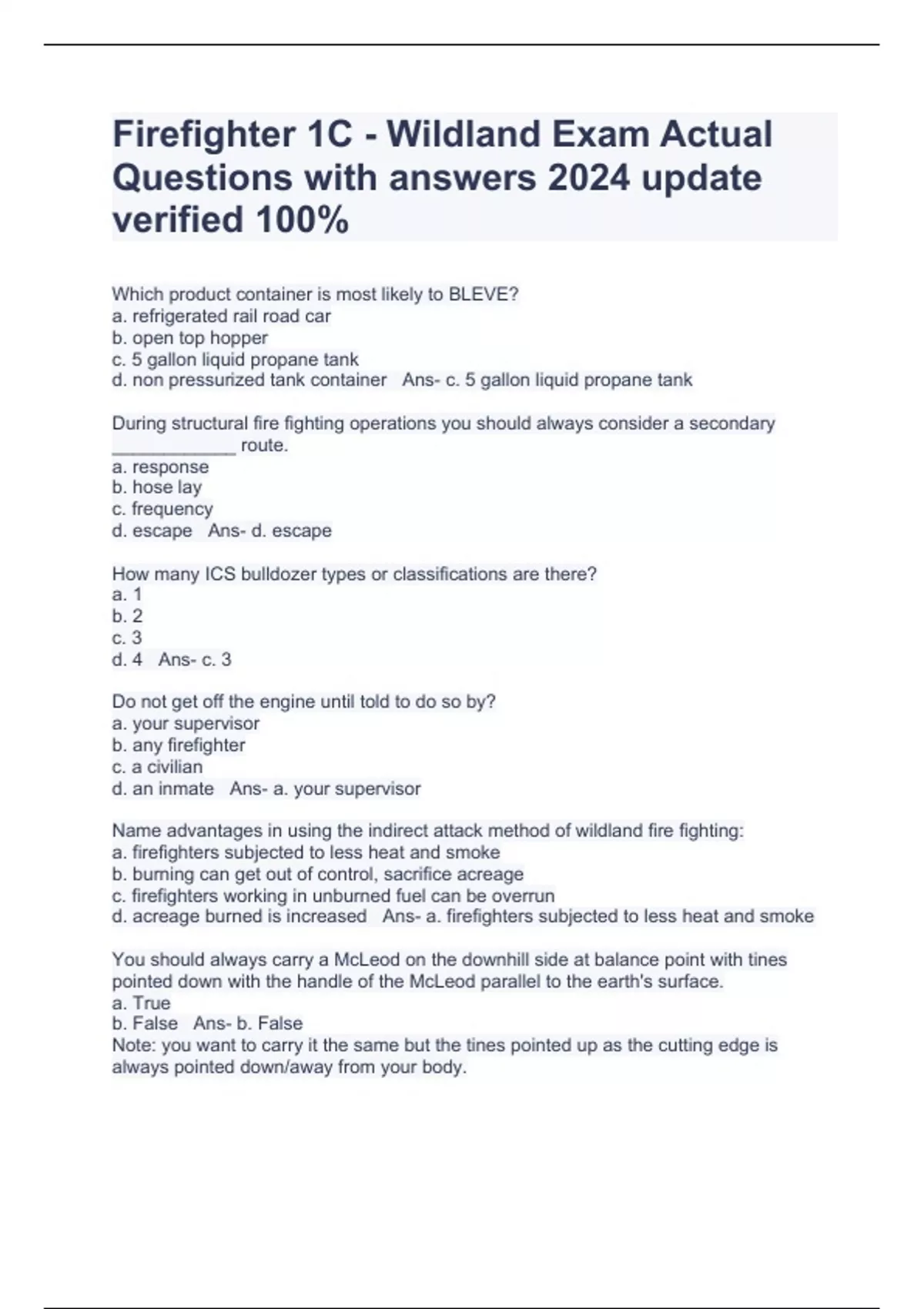Firefighter 1C - Wildland Exam Actual Questions with answers 2024 update verified 100% FF1 WILDLAND ACTUAL QUESTIONS AND ANSWERS VERIFIED 100% FF1 Wildland Exam Study Guide 2024 with complete solution Wildland Final Exam Actual Questions and Answers 2024 with complete solution