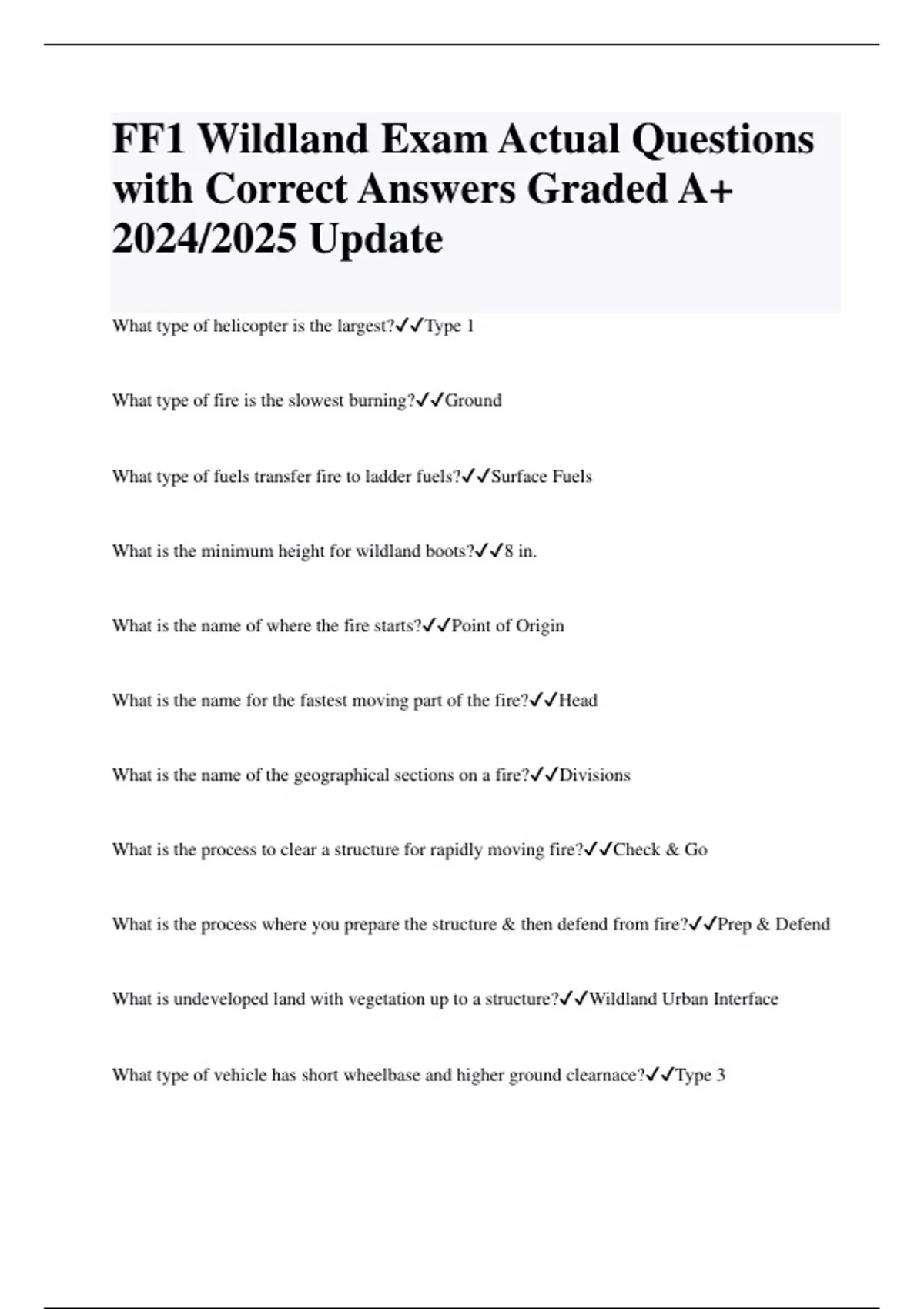 Firefighter 1C - Wildland Exam Actual Questions with answers 2024 update verified 100% FF1 WILDLAND ACTUAL QUESTIONS AND ANSWERS VERIFIED 100% FF1 Wildland Exam Study Guide 2024 with complete solution Wildland Final Exam Actual Questions and Answers 2024 with complete solution