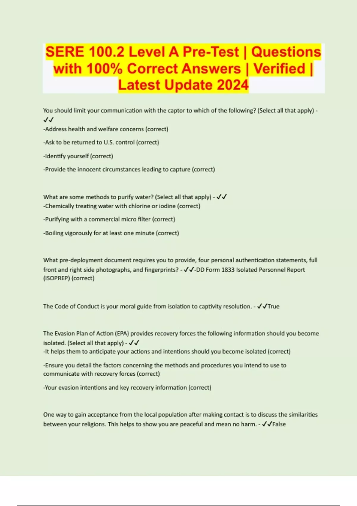 SERE 100.2 Level A SERE Pre-Test | Questions with 100% Correct Answers | Verified | Latest Update 2024