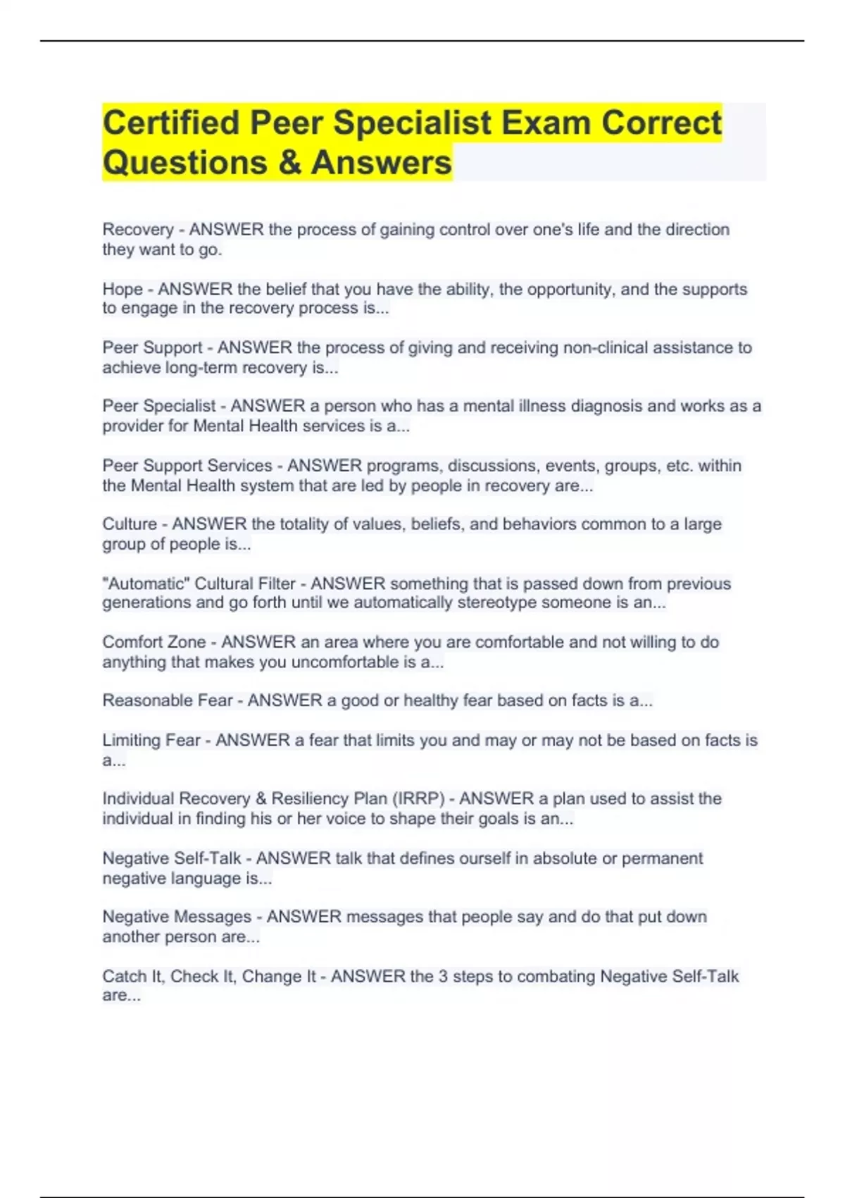 Certified Peer Specialist Exam Correct Questions & Answers(FULL SOLUTIONS PACK!!)EXAM BUNDLECertified Peer Specialist Exam Correct Questions & Answers(FULL SOLUTIONS PACK!!)EXAM BUNDLECertified Peer Specialist Exam Correct Questions & Answers(FULL SOLUTIONS PACK!!)EXAM BUNDLECertified Peer Specialist Exam Correct Questions & Answers(FULL SOLUTIONS