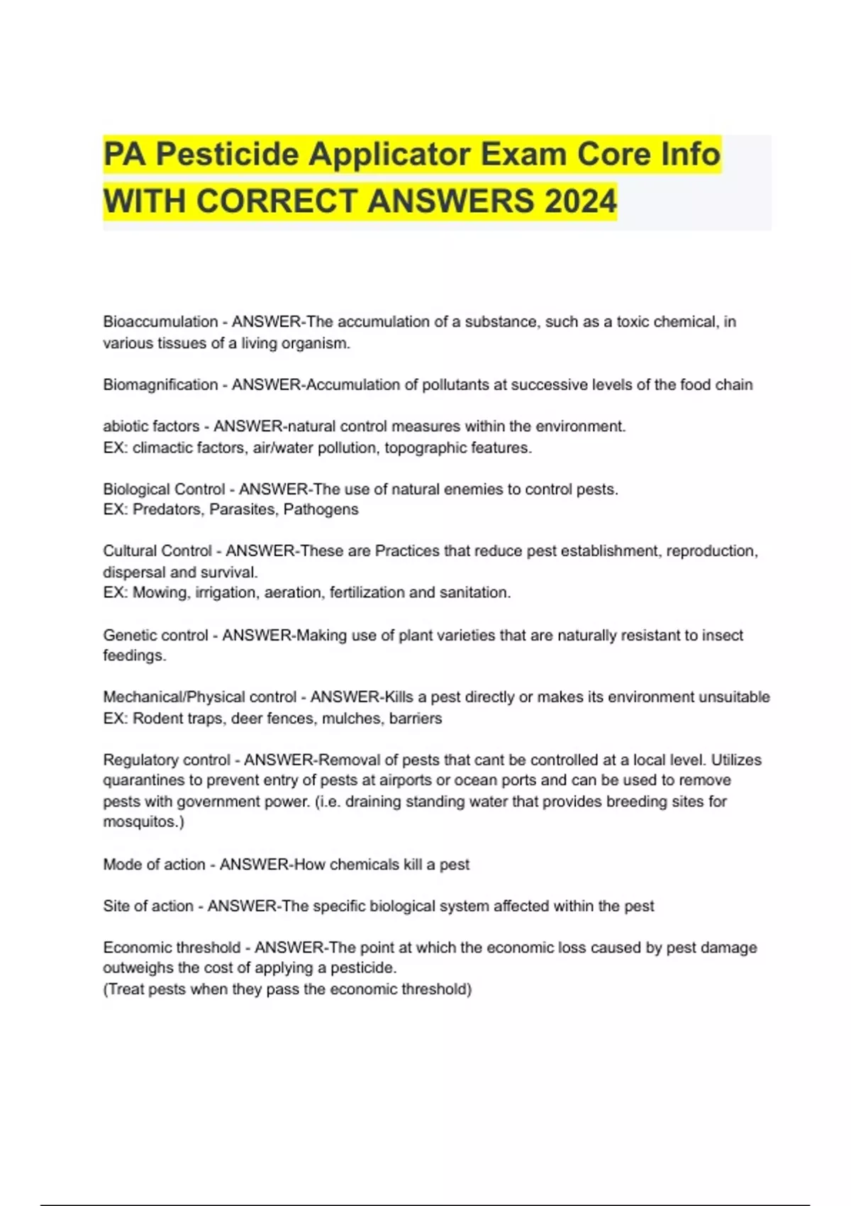 1 Exam (elaborations) National Pesticide Applicator Certification core manual study notes/ questions and answers 2023 2 Exam (elaborations) 2017(updated) Nj core pest control exam study guide 100% correct 3 Exam (elaborations) Pesticide Applicator Certification: Core Manual with complete solutions 2023 4 Exam (elaborations) NC Pesticide