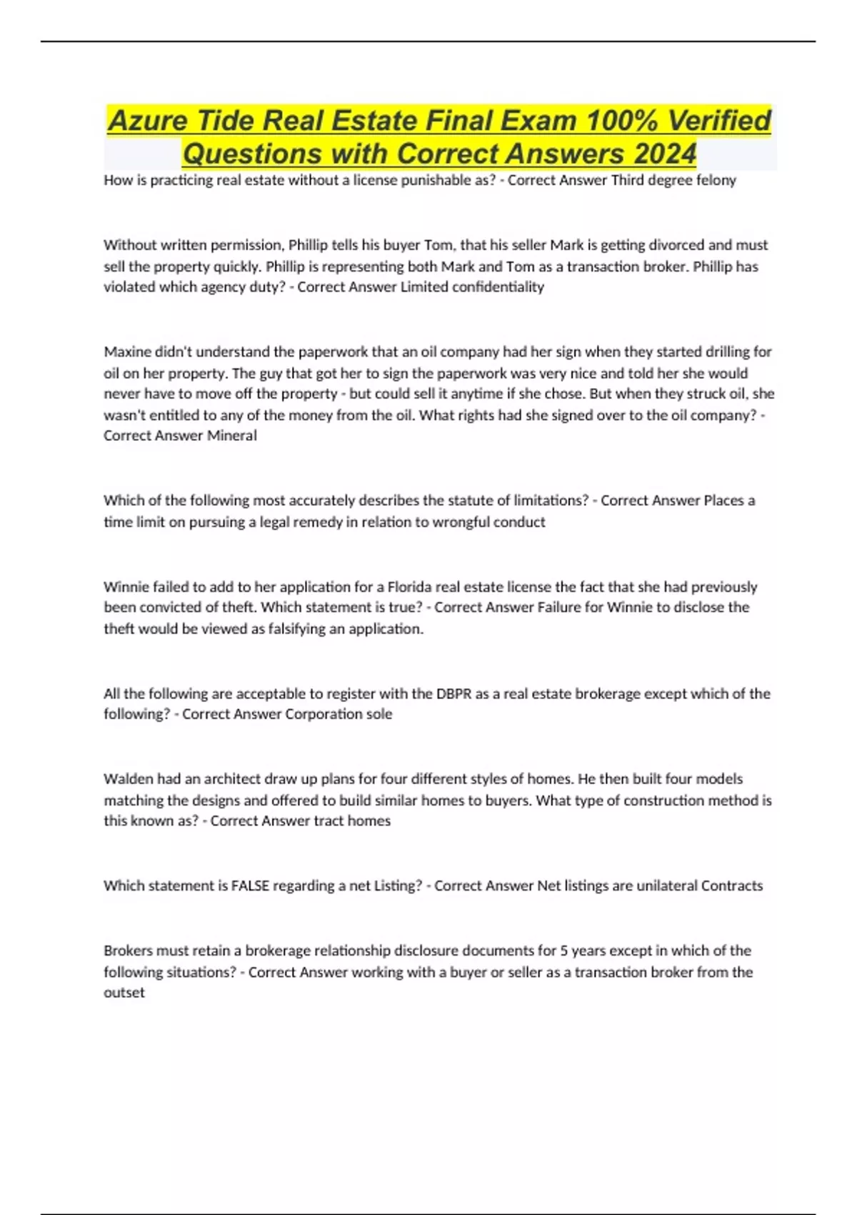 Azure Tide Real Estate Final Exam 100% Verified Questions with Correct Answers 2024
