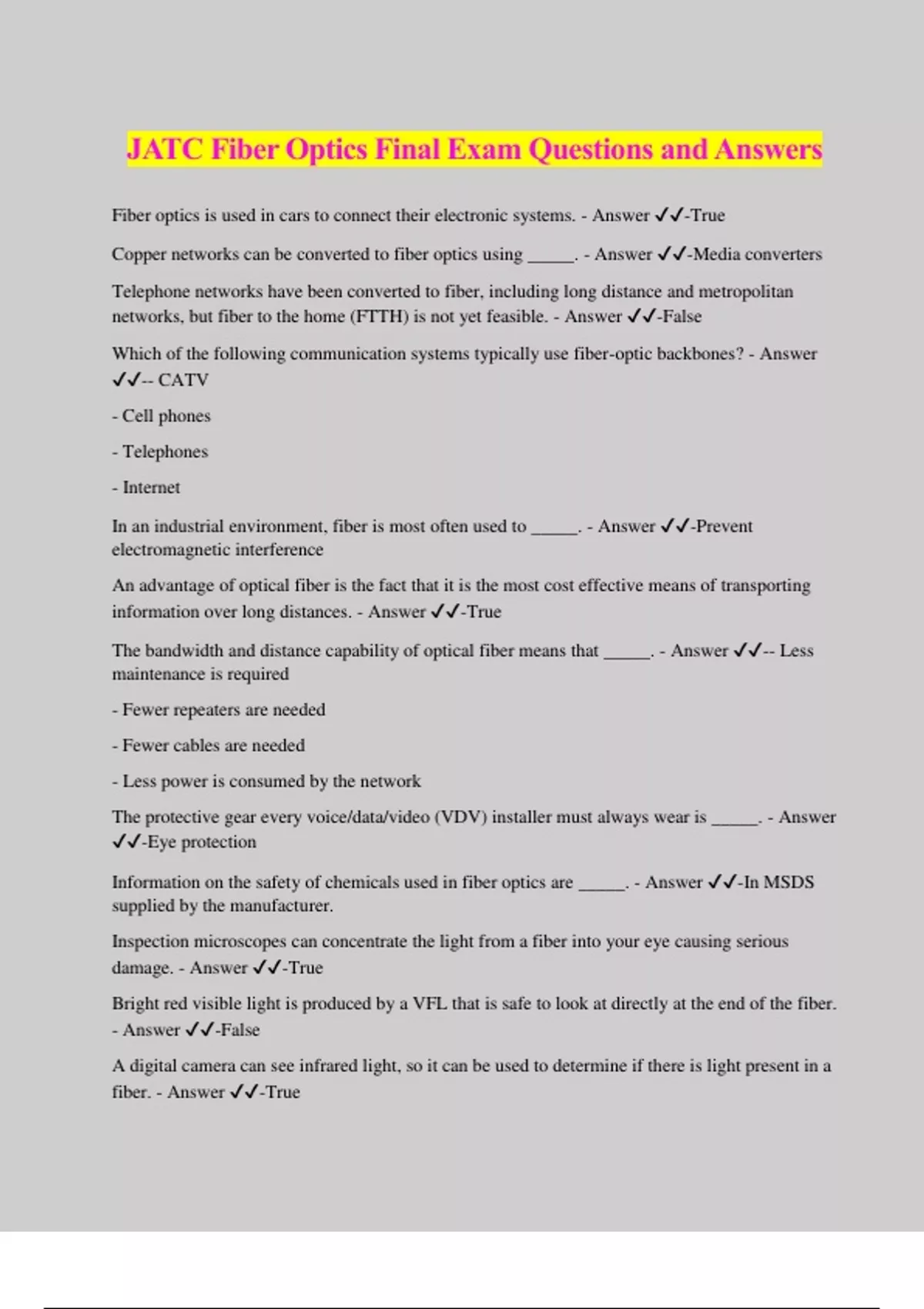 JATC Fiber Optics Final Exam Questions and Answers