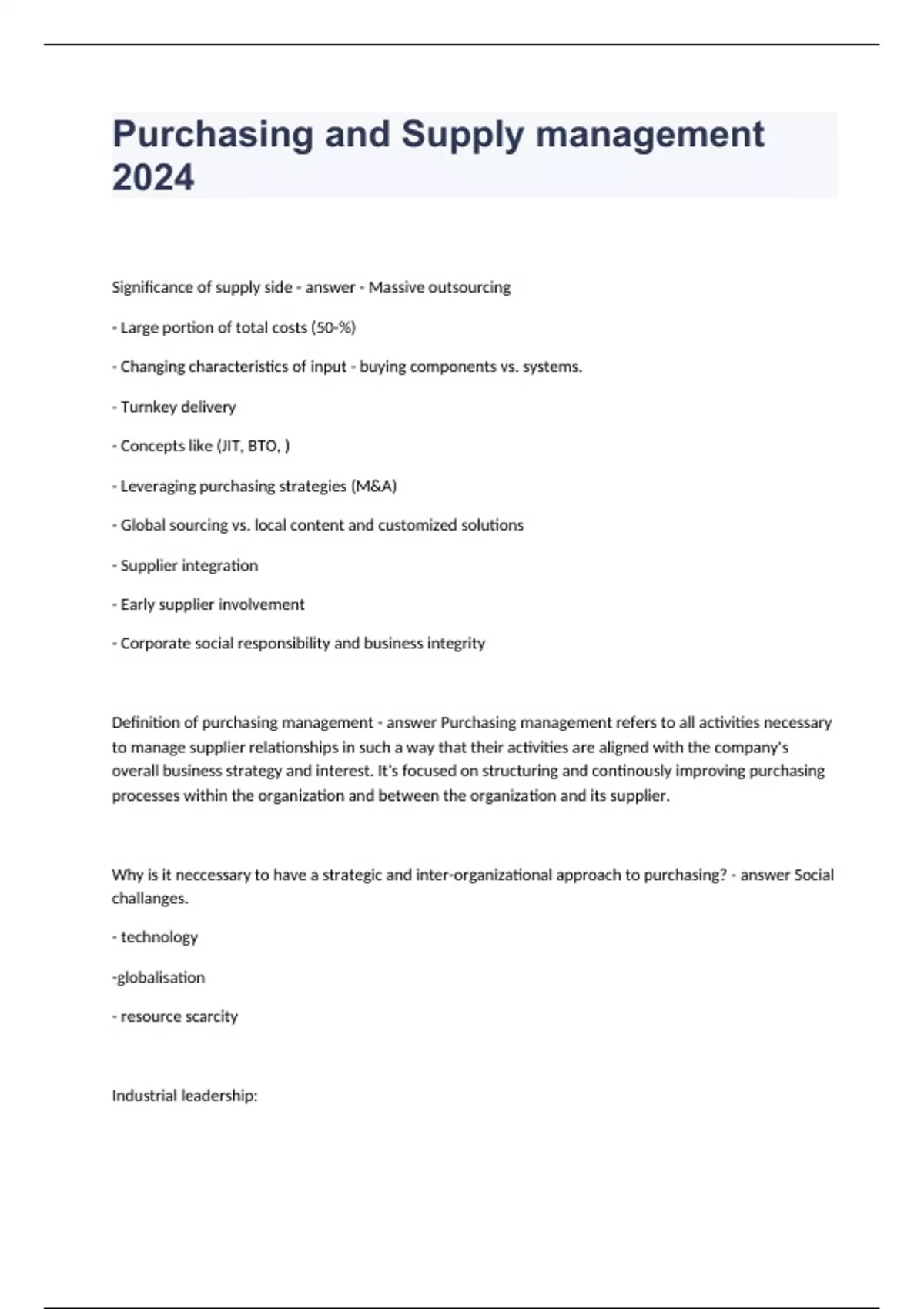 Purchasing and Supply Chain Management TEST BANK SET 2024 IS A BUNDLE THAT COMPRISES ALL ELABORATED,REVIEWED AND WELL ARTICULATED QUESTIONS WITH DETAILED STUDY GUIDE ANSWERS. THE BUN D LE IS UPDATED THUS GUARANTEED PASS(A+).