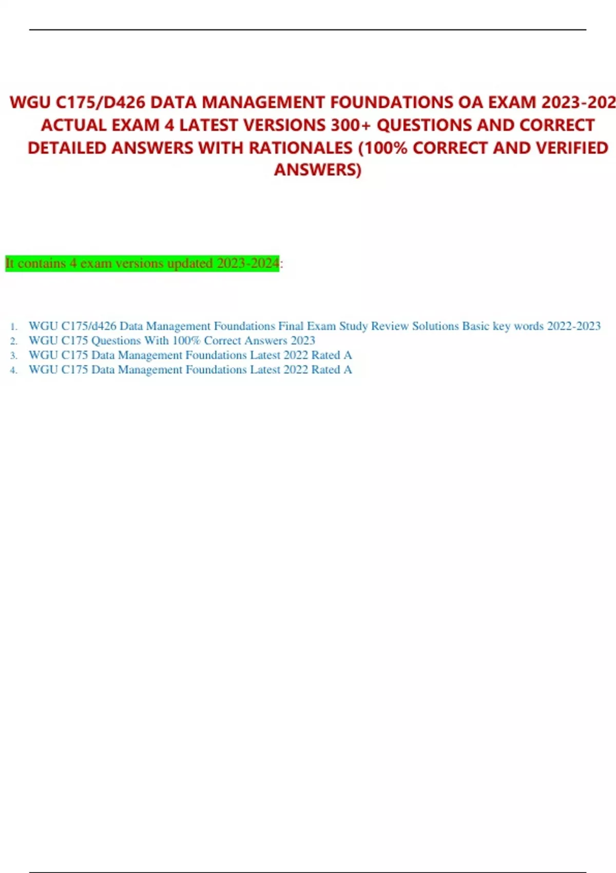 WGU C175-D426 DATA MANAGEMENT FOUNDATIONS OA EXAM ACTUAL EXAM 4 LATEST VERSIONS 300+ Q&A