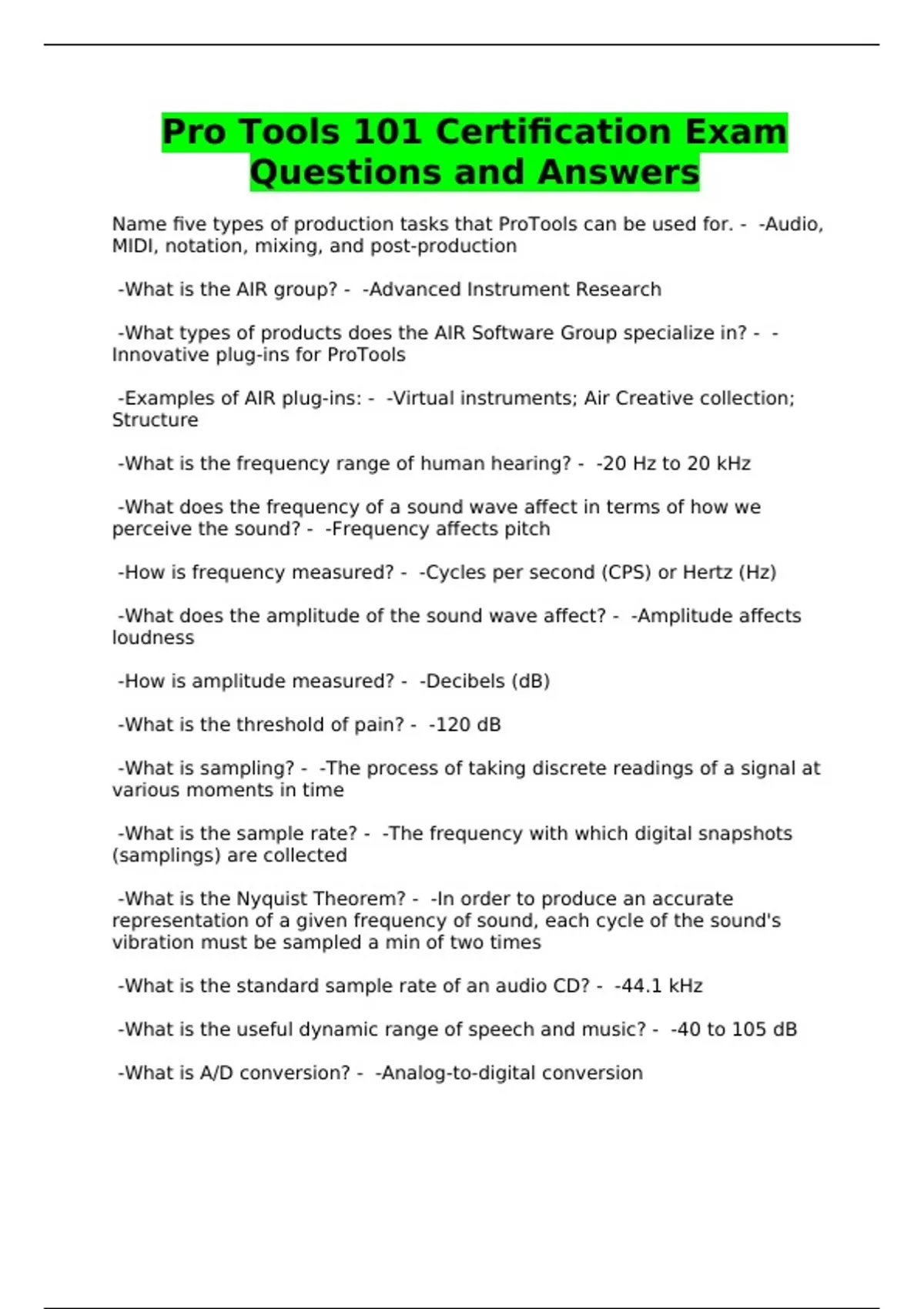 ProTools 101 Certification Study Guide Exam Questions with Verified Solutions
