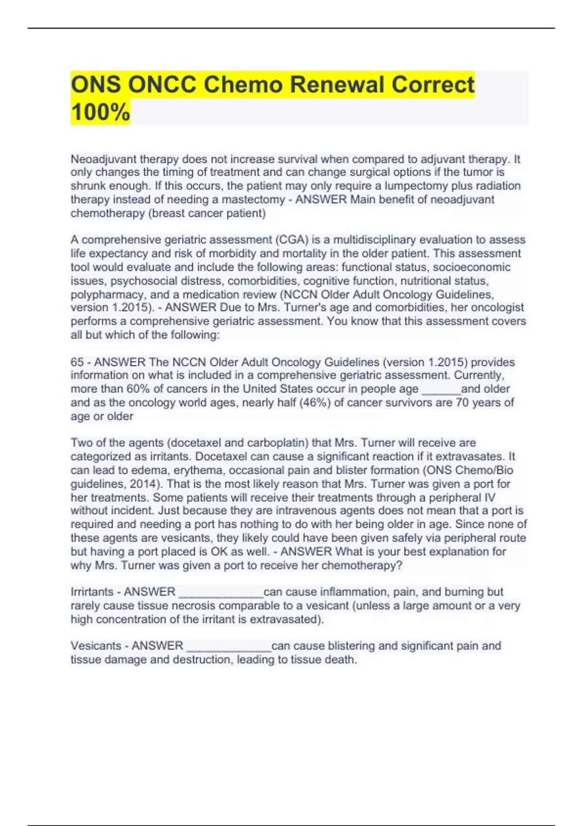 ONS/ONCC Chemotherapy Immunotherapy Certificate| 135 Questions| Correct Answers!!PACKAGE DEALONS/ONCC Chemotherapy Immunotherapy Certificate| 135 Questions| Correct Answers!!PACKAGE DEALONS/ONCC Chemotherapy Immunotherapy Certificate| 135 Questions| Correct Answers!!PACKAGE DEALONS/ONCC Chemotherapy Immunotherapy Certificate| 135 Questions| Correct