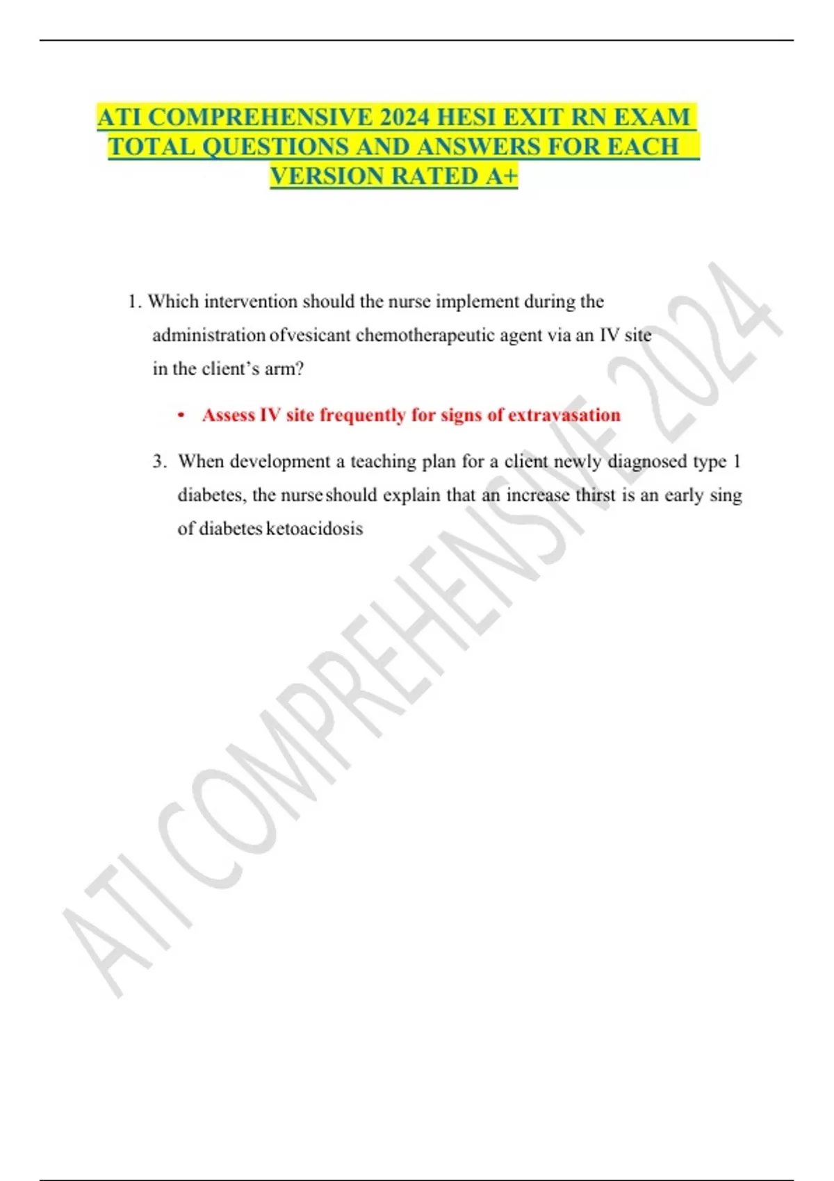 ATI COMPREHENSIVE 2024 HESI EXIT RN EXAM TOTAL QUESTIONS AND ANSWERS FOR EACH VERSION RATED A+ 1. Which intervention should the nurse implement during the administration ofvesicant chemotherapeutic agent via an IV site in the client’s arm? • Assess IV site frequently for signs of extravasation 3. When development a teaching plan for a client newly