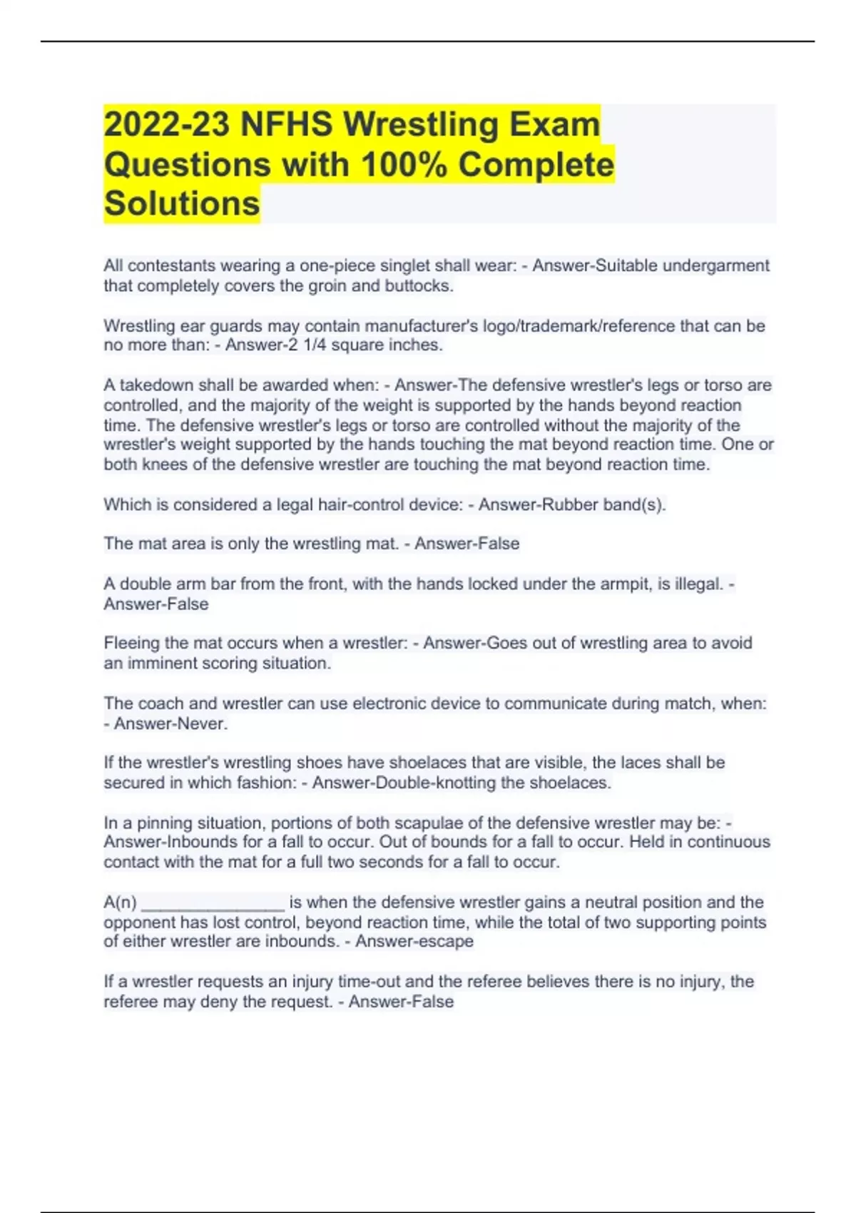 Exam (elaborations) Wrestling Exam Questions and Answers Exam (elaborations) Wrestling Exam Questions and Answers 2023 Exam (elaborations) Test 2 NFHS Exam Questions and Answers 2023 Exam (elaborations) Techniques of officiating- wrestling 2023 Exam Questions and Answers Exam (elaborations) Student Response Packet: Wrestling Exam Questions