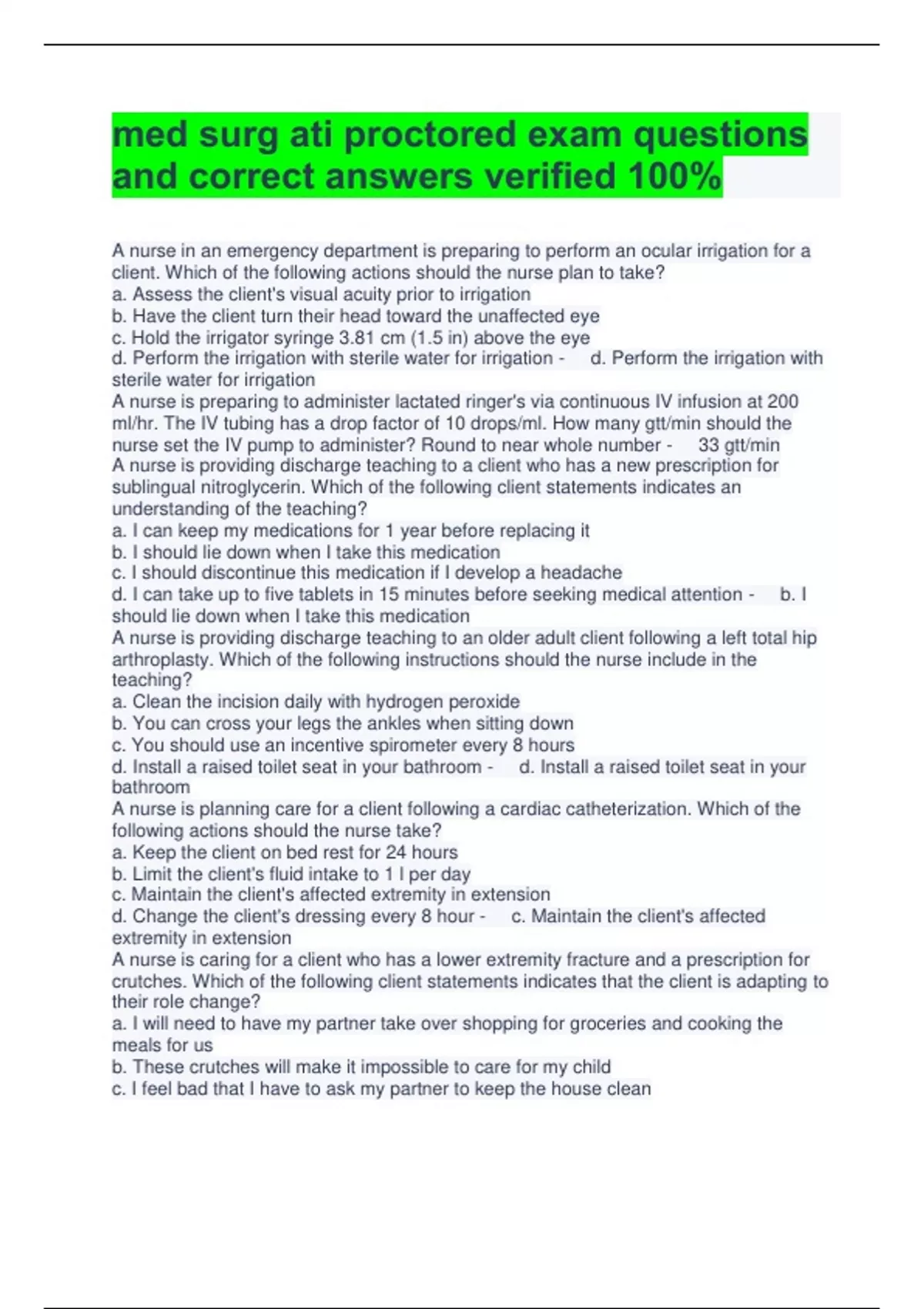 Ati prctored ,medsurg, peds ati, etc questions and answers verified 100% the best deal in multiple study documents. Download for more coverage