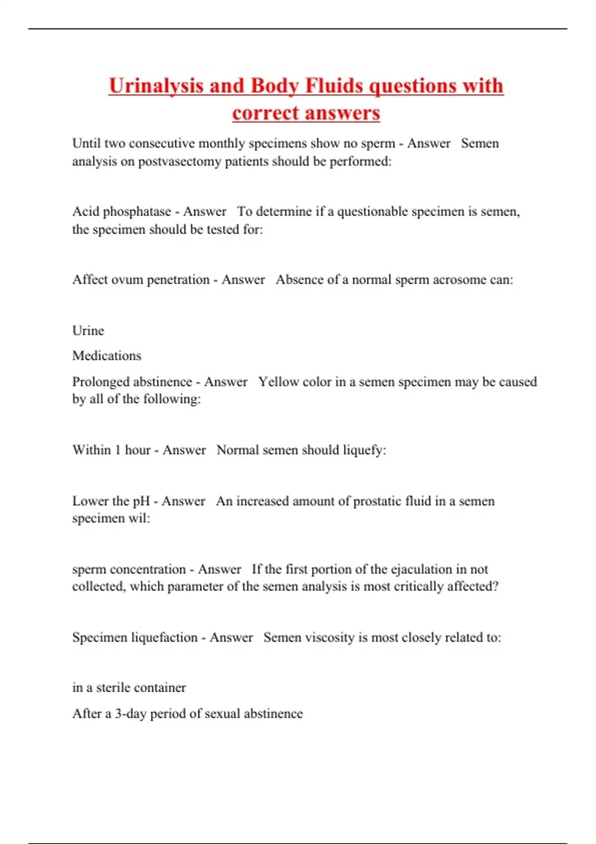Urinalysis & Body Fluids questions with correct answers