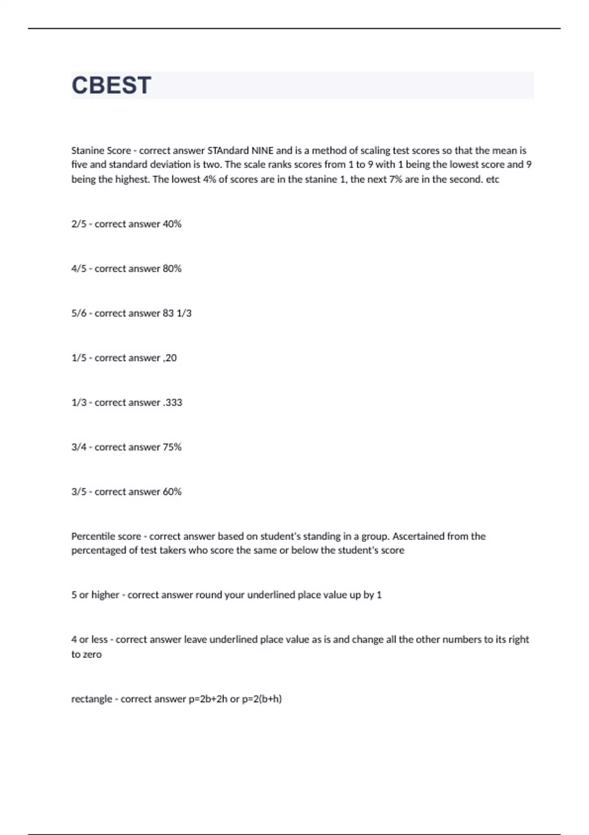 1 Exam (elaborations) CBEST - Math question n answers rated A+ 2023/2024 already passed 2 Exam (elaborations) CBEST Math - Interpreting Standardized Test Scores with 100% correct answers 3 Exam (elaborations) [CBEST/CSET]questions n answers graded A+ 2023/2024 4 Exam (elaborations) CBEST STUDY GUIDE correctly answered to pass 2023/2024
