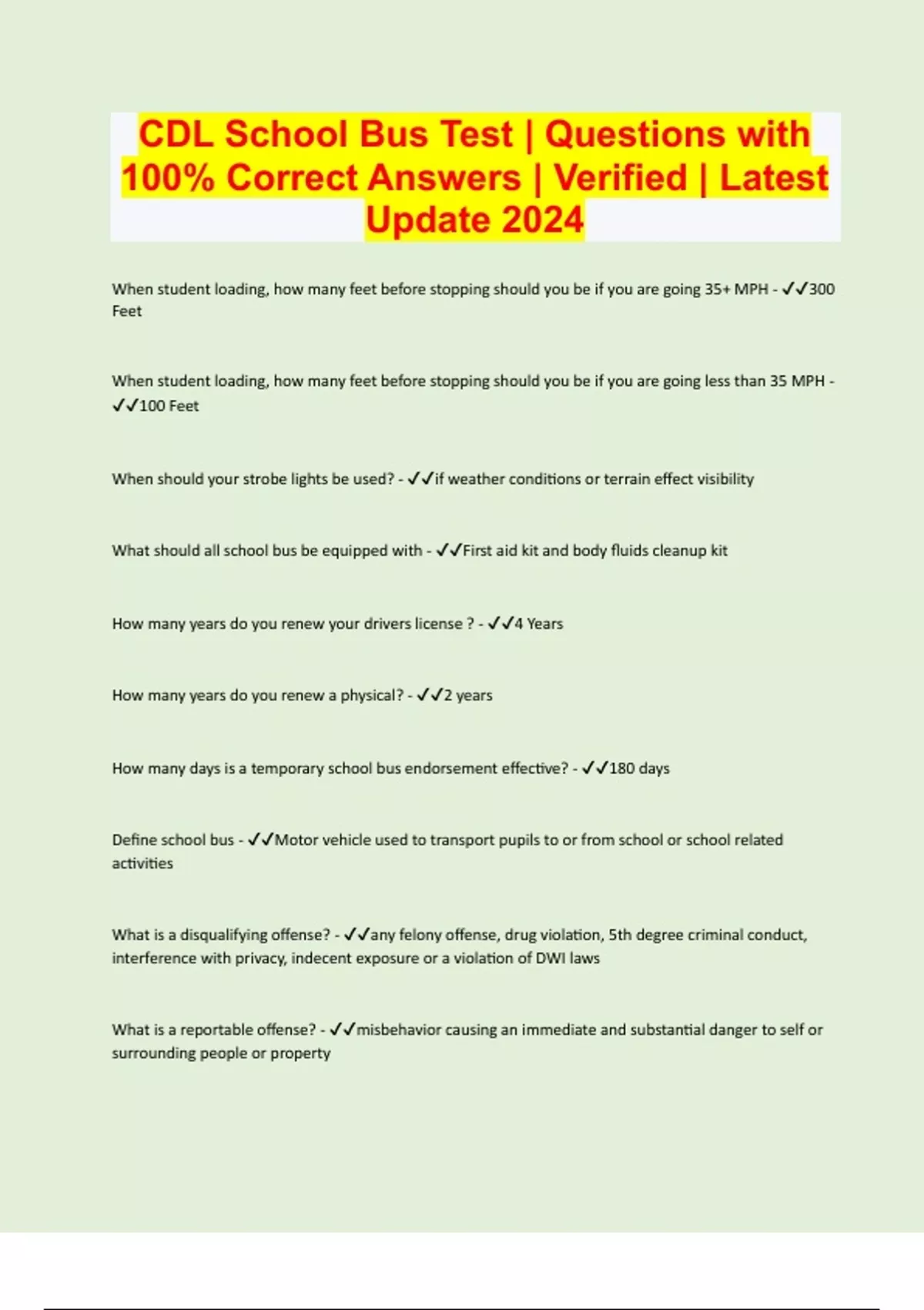 School Bus Exam | 50 Questions with 100% Correct Answers | Verified | Latest Update 2024