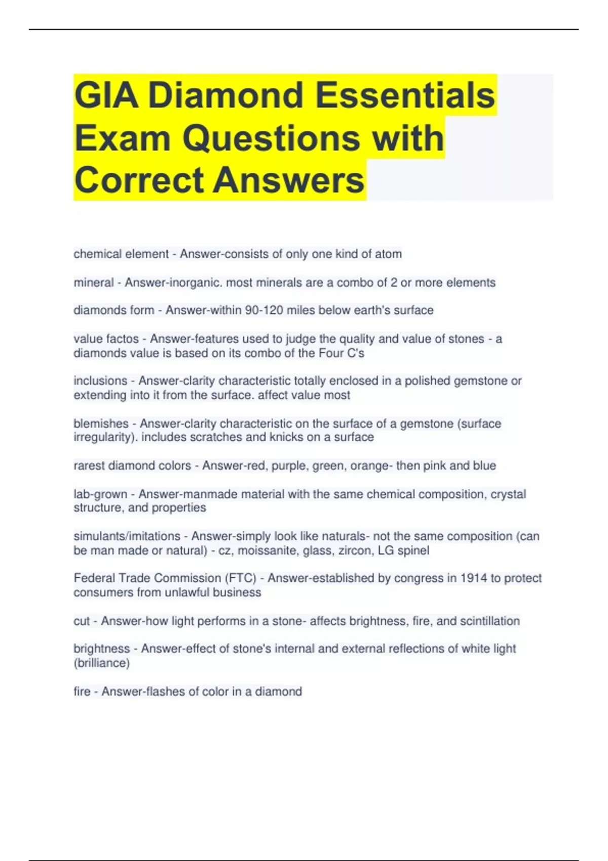 1 Exam (elaborations) GIA DE 2 Test Questions with Correct Answers 2 Exam (elaborations) GIA chapter 1 Exam Questions with Correct Answers 3 Exam (elaborations) GIA Exam Questions with All Correct Answers 4 Exam (elaborations) GIA Diamond Grading Quiz 2 Questions with Correct Answers 5 Exam elaborations GIA vocabulary Exam Questions and Answers