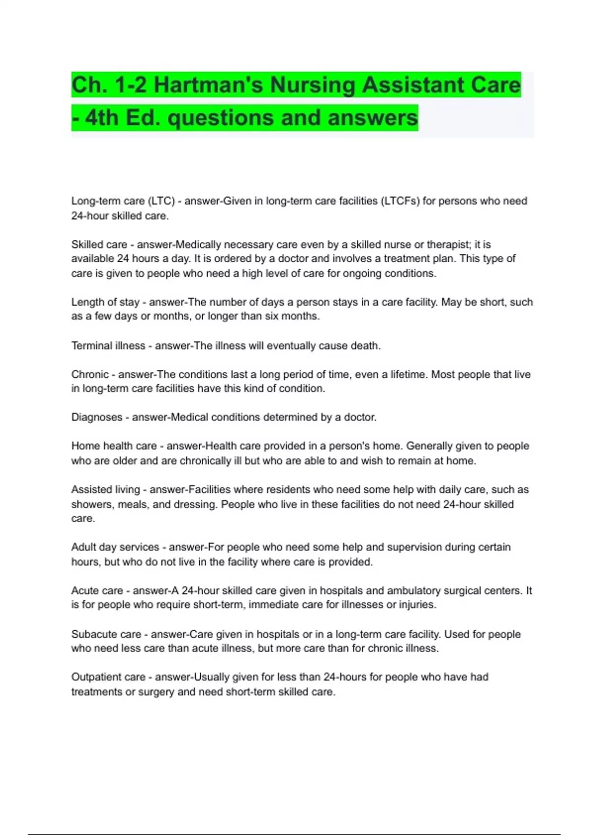 Hartmans Nursing Assistant Care/Hartman s CNA exam complete bundle