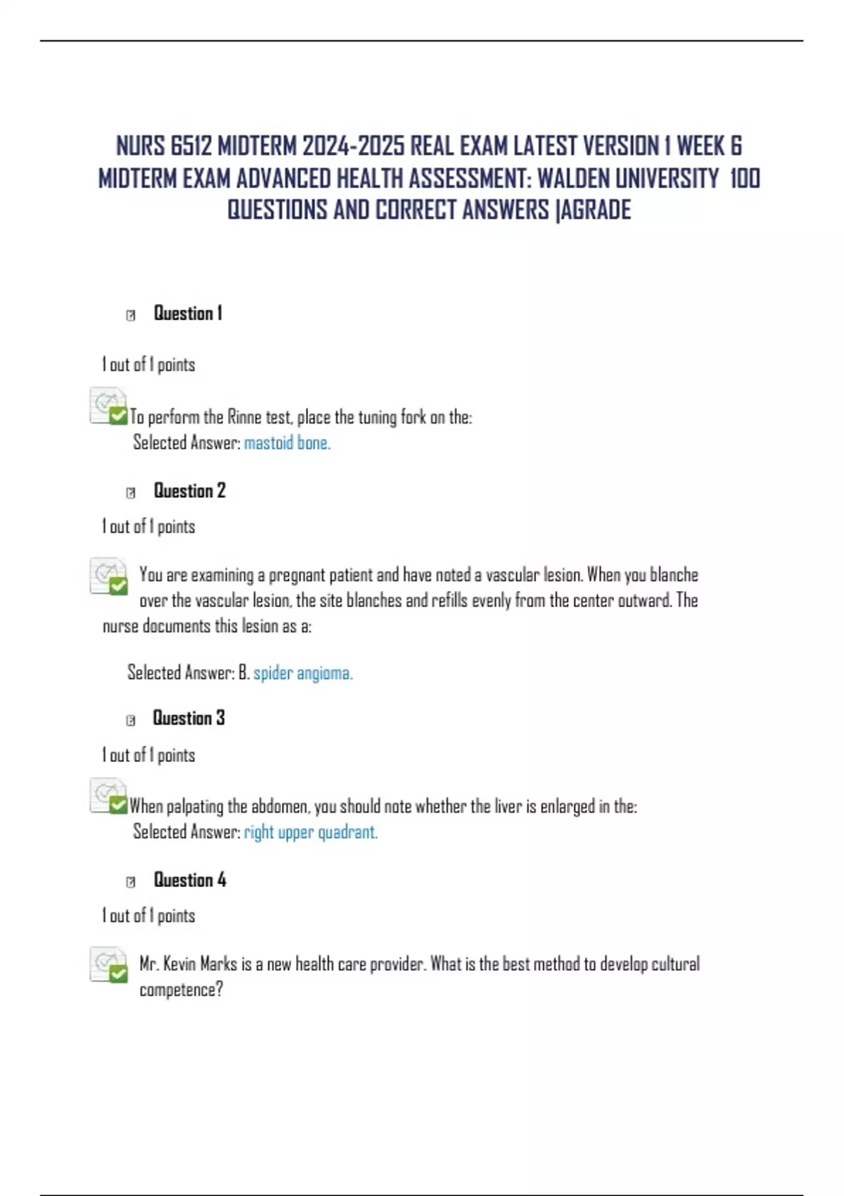 NURS 6512D-5/NURS-6512C-5/NURS-6512N-5 MIDTERM REAL EXAM LATEST VERSION 1 WEEK 6 MIDTERM EXAM ADVANCED HEALTH ASSESSMENT 100 Q AND ANS |AGRADE 2 Exam (elaborations) NURS6512 ADVANCED HEALTH ASSESSMENT FINAL EXAM 100 QUESTIONS AND ANSWERS|AGRADE 3 Exam (elaborations) NURS/NRNP 6512 MIDTERM REAL EXAM LATEST VERSION 1 WEEK 6 MIDT