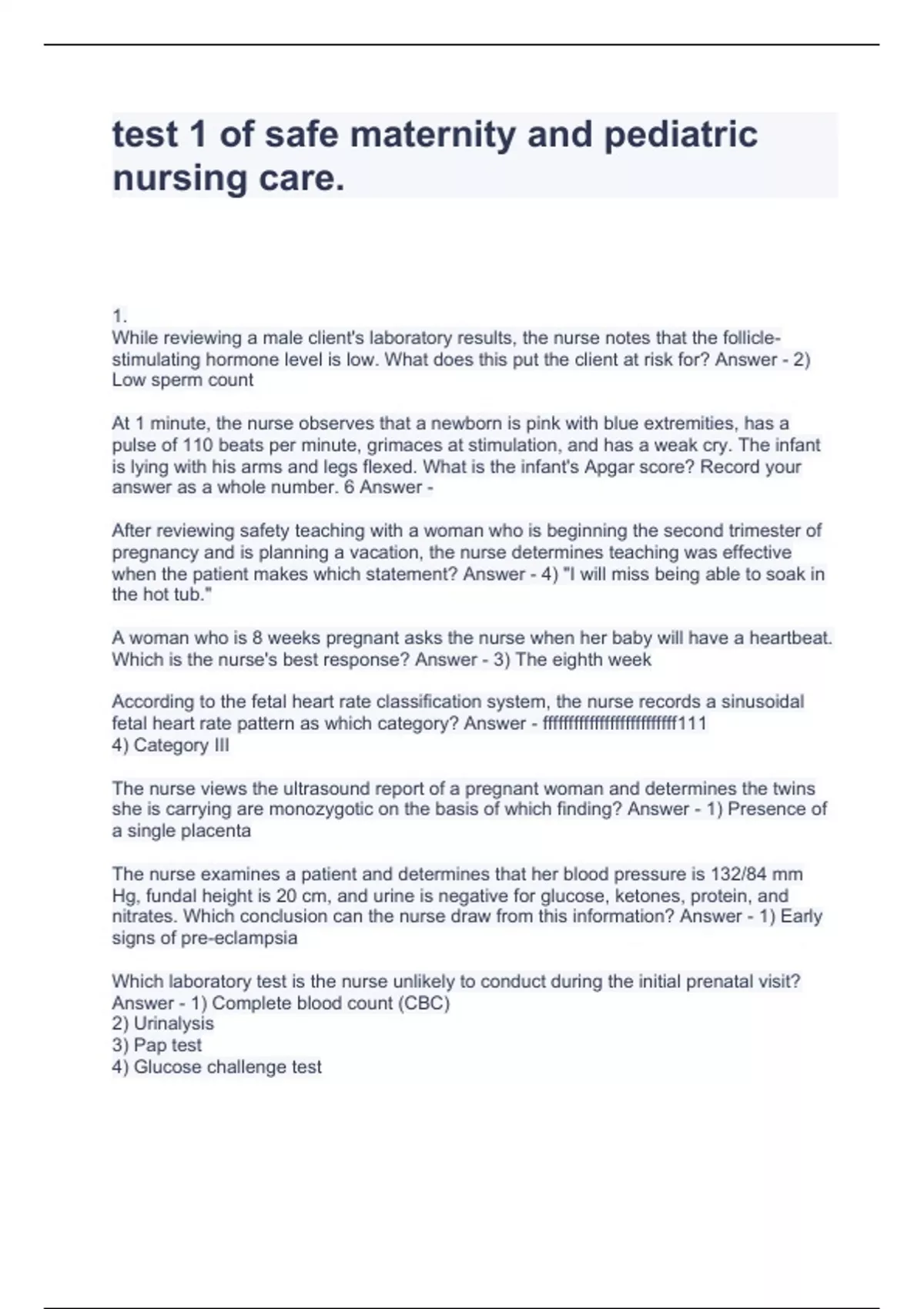Maternity and Pediatric Nursing exam 1 questions and answers