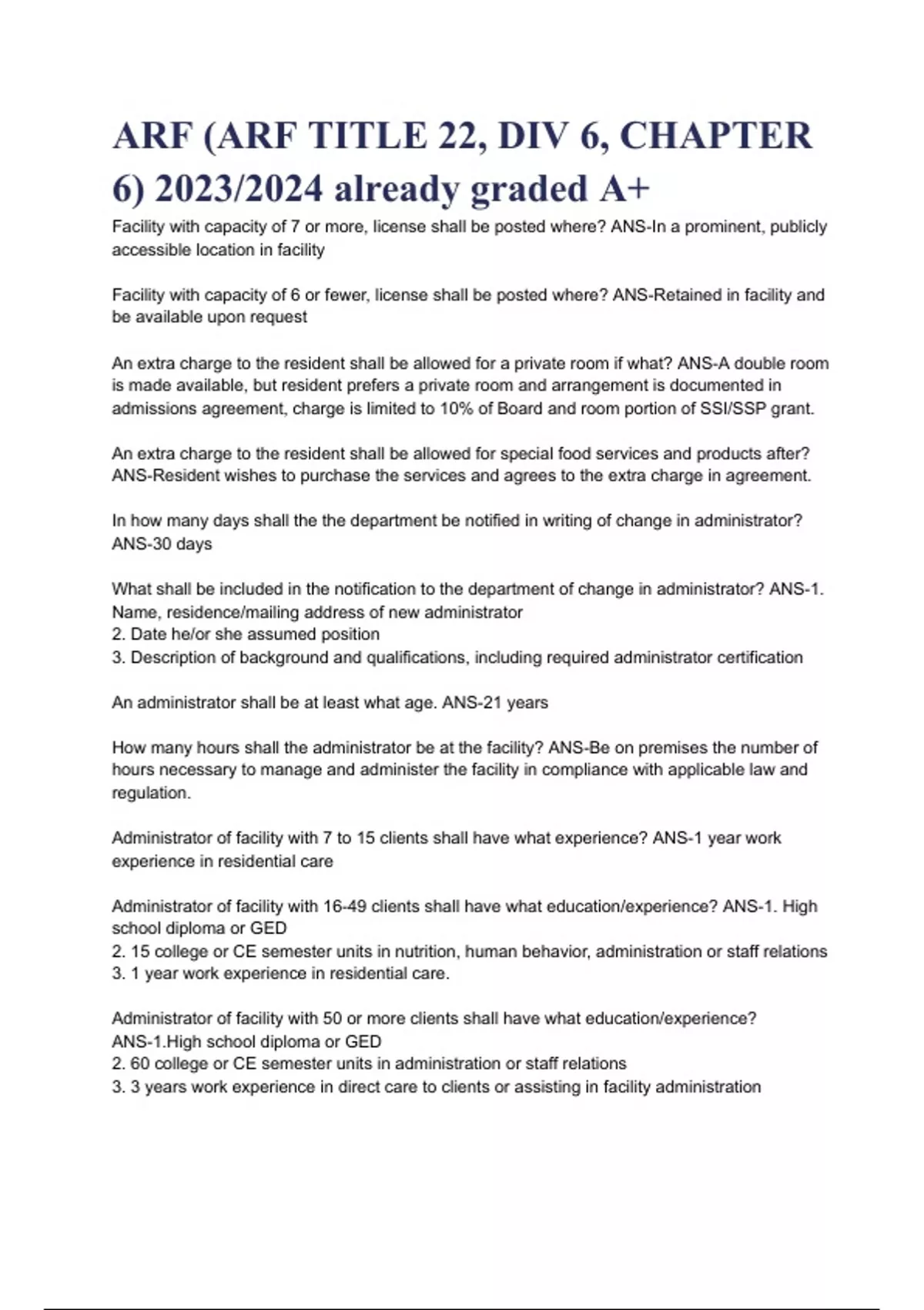 Adult Residential Facility (ARF) Practice Test, California ARF Administrator Study Guide, ARF (ARF TITLE 22, DIV 6, CHAPTER 6) |260| Questions With Complete Solution/California ARF Administrator Study Guide Exam with complete solution/ARF (ARF TITLE 22, DIV 6, CHAPTER 6) 2023/2024 already graded A+
