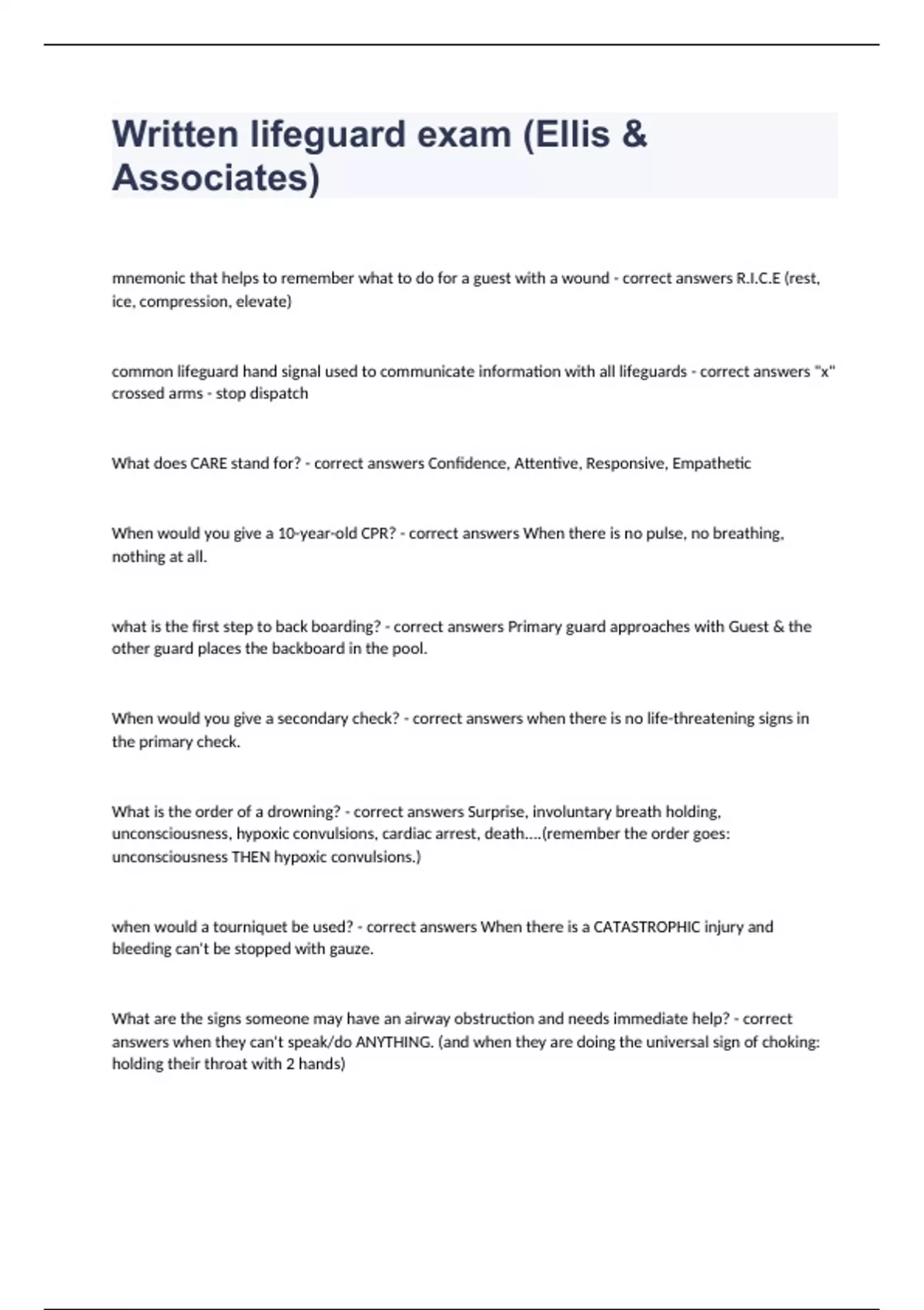 1 Exam (elaborations) A&E Lifeguard Module 3 answers 2023/2024 passed 2 Exam (elaborations) Ellis & Associates: Great Wolf Lodge Lifeguard Module Content 2023/2024 passed 3 Exam (elaborations) Ellis & Associates Lifeguard Exam 2023/2024