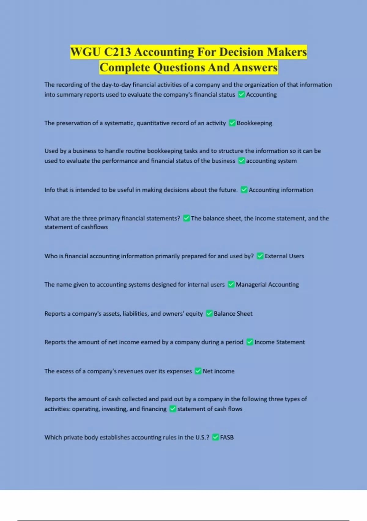 WGU C213 Accounting For Decision Makers Verified Bundle With Latest Updates WGU C213 Topics 1-6 Quizzes 2022 (51% Of Exam Competencies) Questions And Answers WGU C213 PA & OA Study Guide Verified Study Questions And Answers Rated A+ WGU C213 Pre-Assessment 2024 Verified Questions And Answers Graded A+