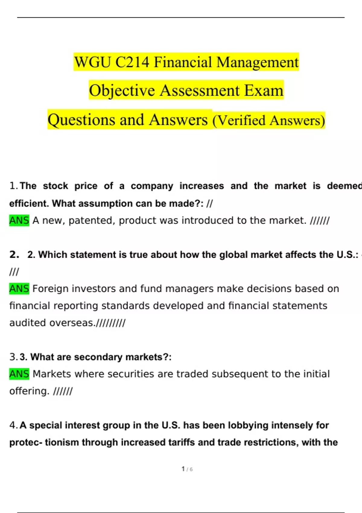 WGU C214 FINANCIAL MANAGEMENT OBJECTIVE & PRE ASSESSMENT EXAM LATEST BUNDLE PACK SOLUTION (VERIFIED) WGU C214 FINANCIAL MANAGEMENT OBJECTIVE & PRE ASSESSMENT EXAM LATEST BUNDLE PACK SOLUTION (VERIFIED)