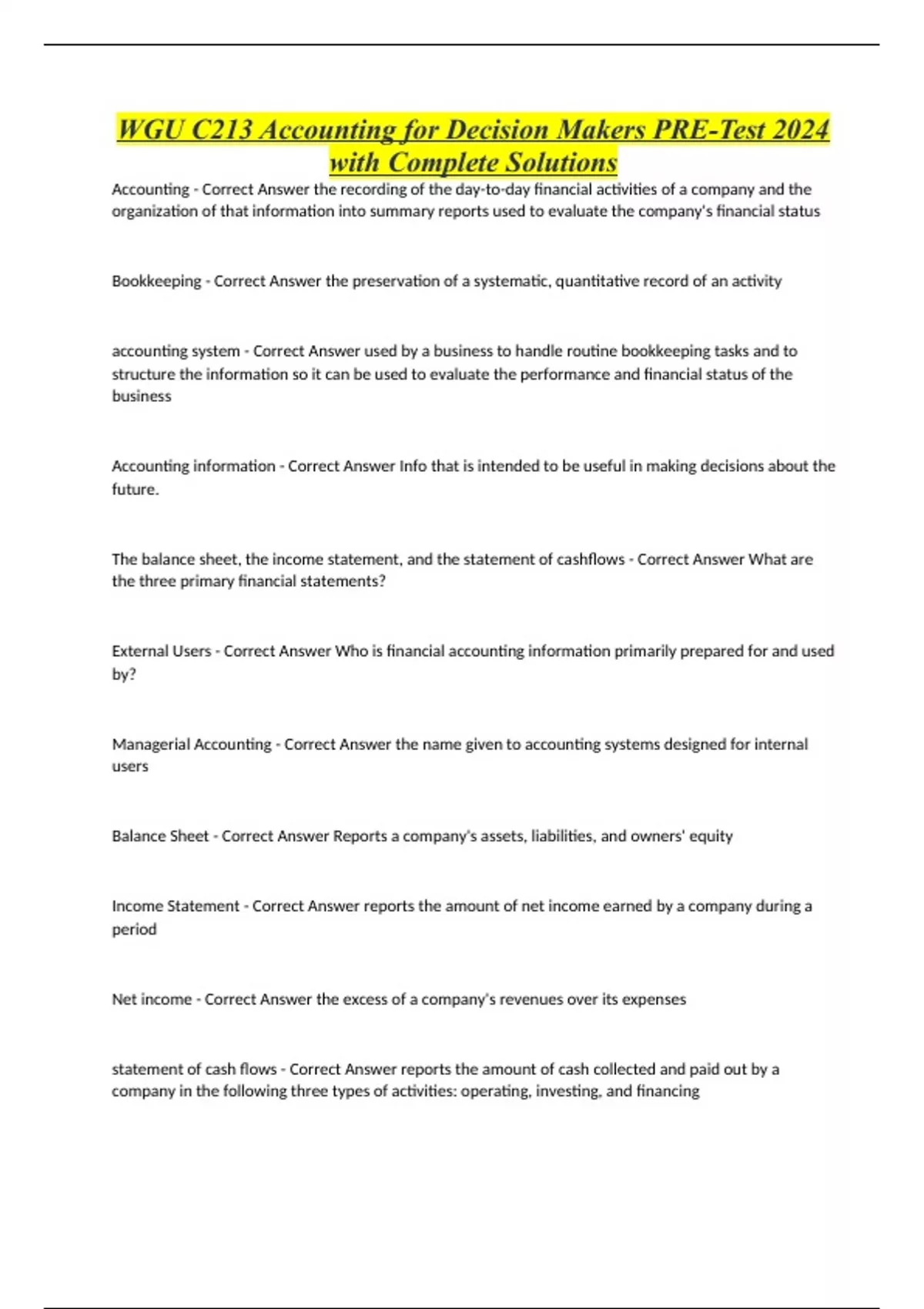 WGU C213 Accounting for Decision Makers PRE-Test 2024 with Complete Solutions