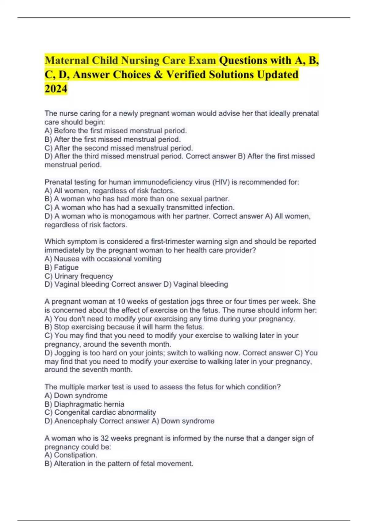 Maternal Child Nursing Care during Pregnancy Exam with Thorough Questions and Highly Accurate Answers 19 Pages Revised 2024 Maternal Child Nursing Care and Foetal Nutrition Exam with Standard Questions and Extensive Answers 16 Pages Updated 2024/2025 Maternal Child Nursing Care and Foetal Nutrition Exam with Standard Questions and Extensive Answer