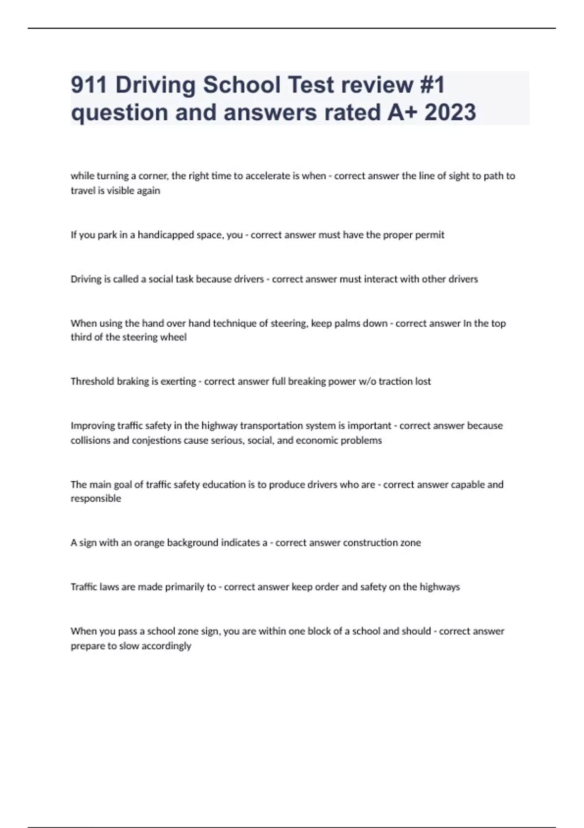 911 Drivers Ed Final Test Study Sheet question with correct answers already passed 2023/2024 Exam (elaborations) 911 Drivers Ed Test #1 question & answers graded A+ 2023/2024 verified to pass Exam (elaborations) 911 Driving Knowledge Test question and answers 100% correct 2023/2024 Exam (elaborations) 911 Driving School - Knowledge Test Quest