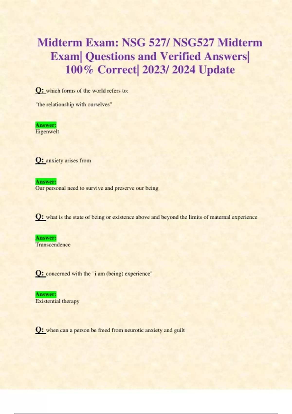 Midterm Exam: NSG527/ NSG 527 (Latest 2024/ 2025) Psychopathology, Theories, and Advanced Clinical Modalities Review| Questions and Verified Answers| 100% Correct| Grade A