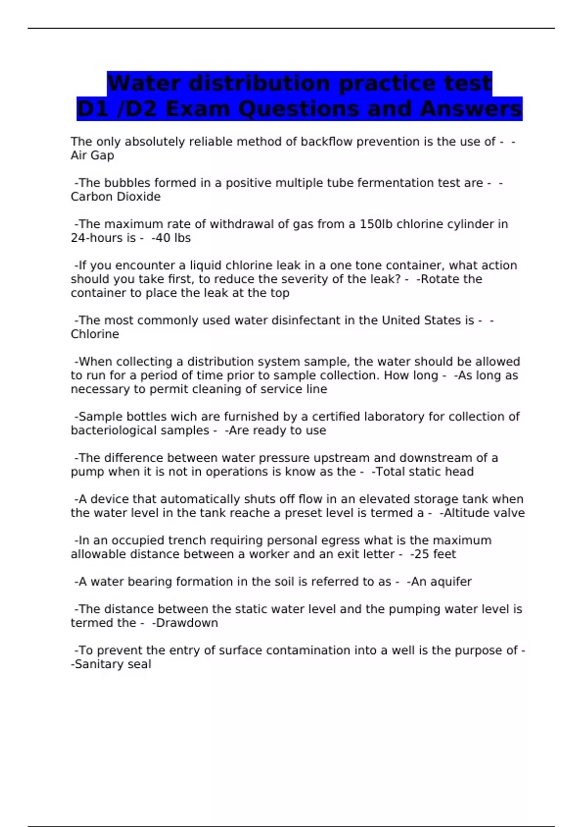 Water distribution practice test D1 /D2 Exam Questions and Answers