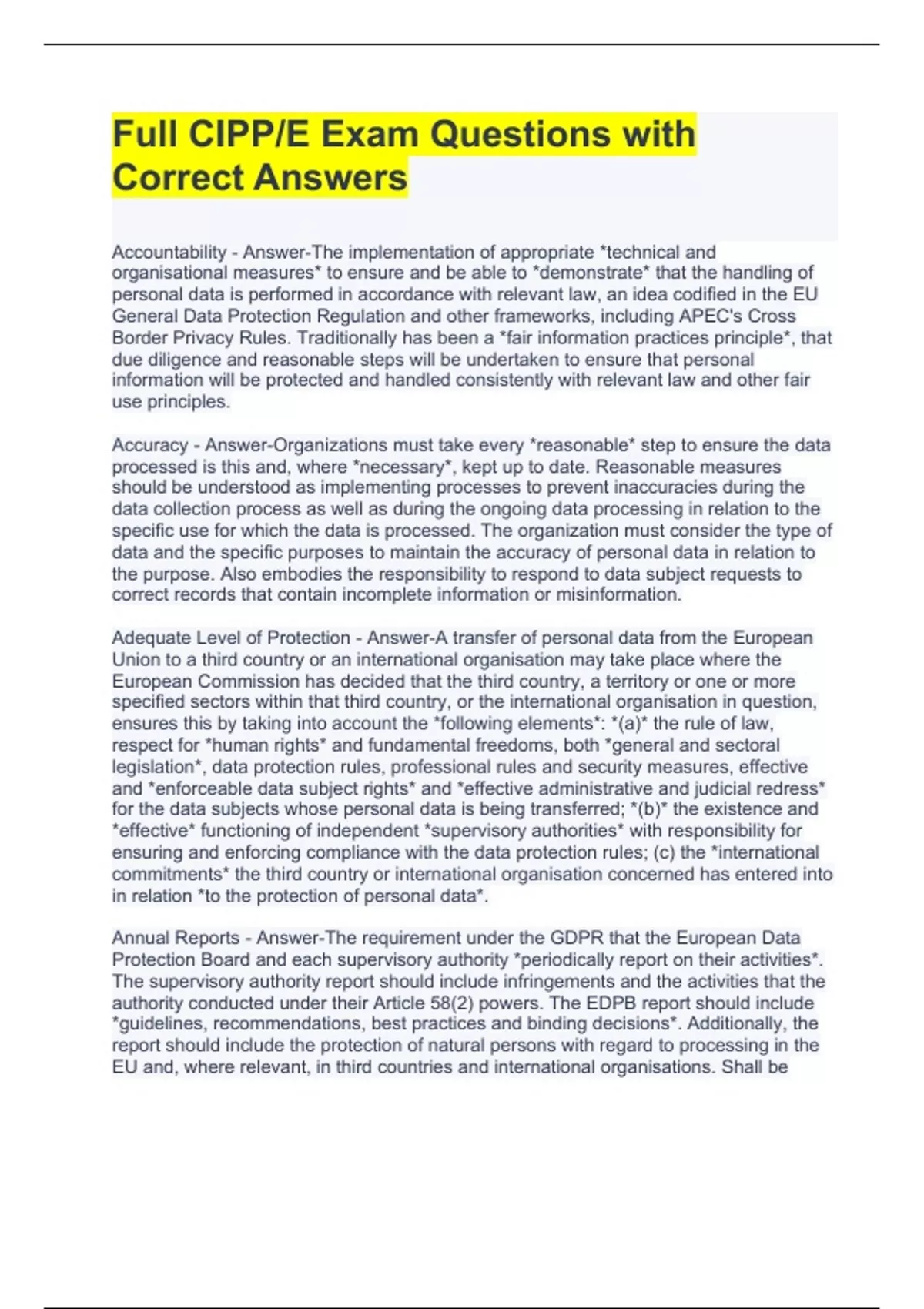 Exam (elaborations) CIPP Exam Prep Questions with Verified Answers Exam (elaborations) CIPP Exam Questions and Answers Exam (elaborations) CIPP Study Guide Exam Questions with Complete Solutions Exam (elaborations) CIPP/E IAPP Practice Questions with Answers 2023 Exam (elaborations) CIPP/US - PRINCIPLES OF INFORMATION MANAGEMENT