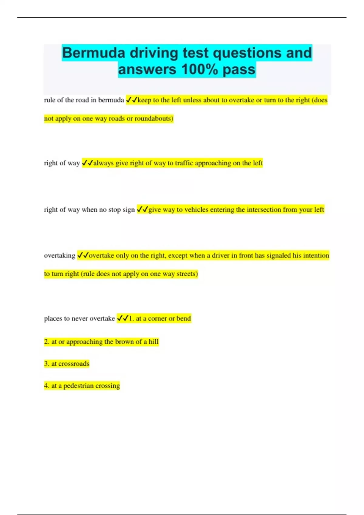Bermuda Driving Test Bundled Exams Questions and Answers Already Passed