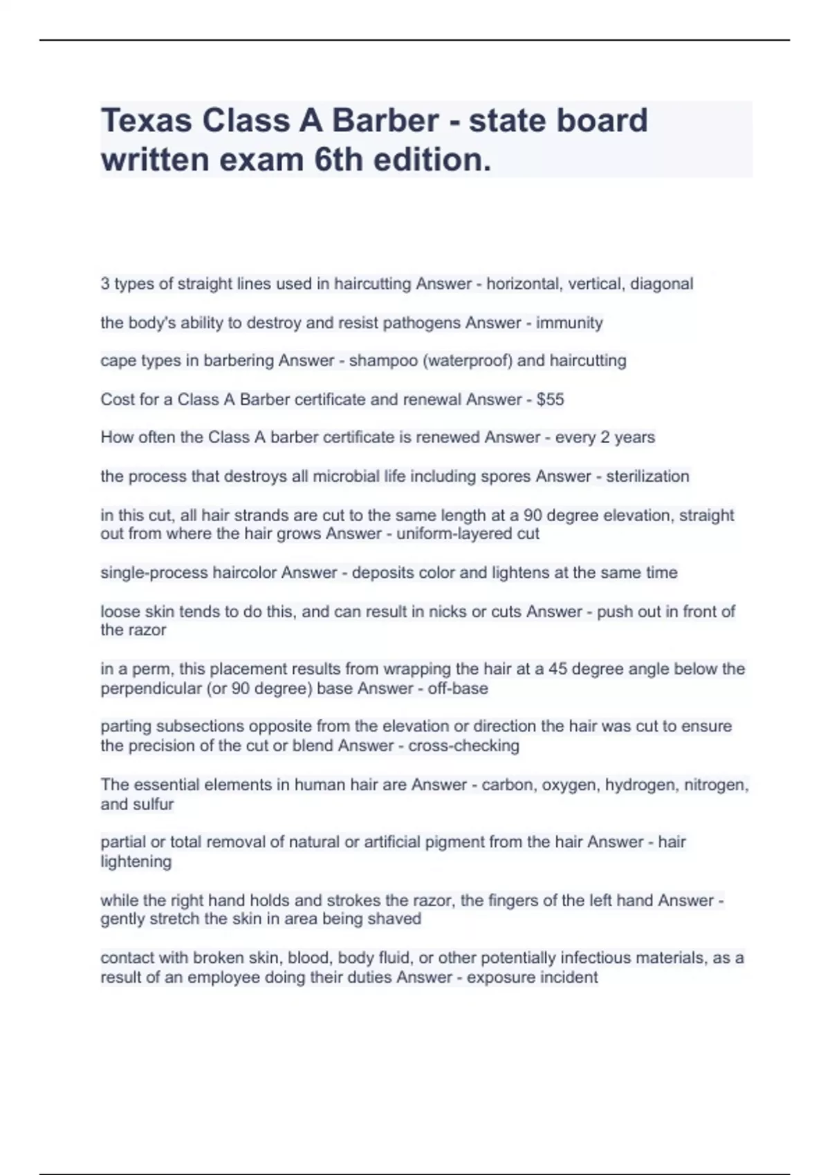 Texas Barber Exam Practice Test Questions and Answers