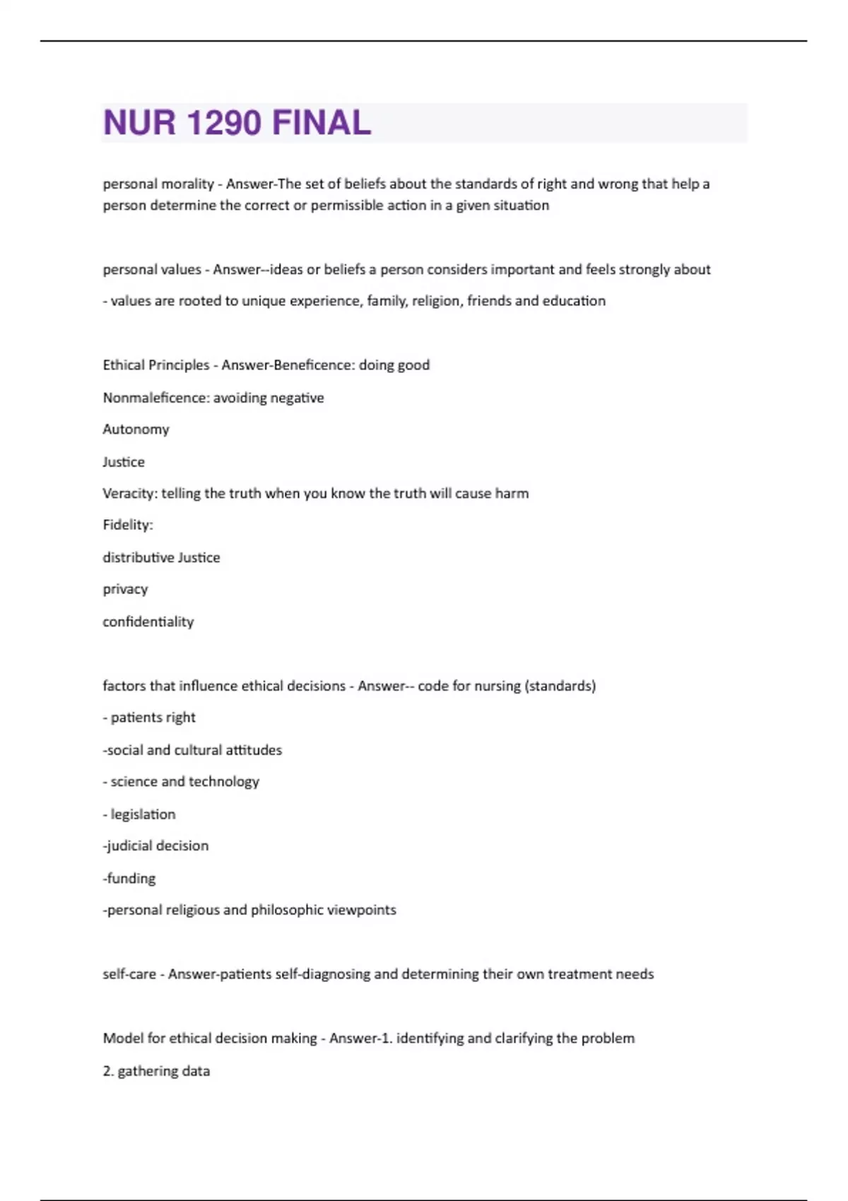 NUR 1290 FINAL Questions With 100% Correct Answers.