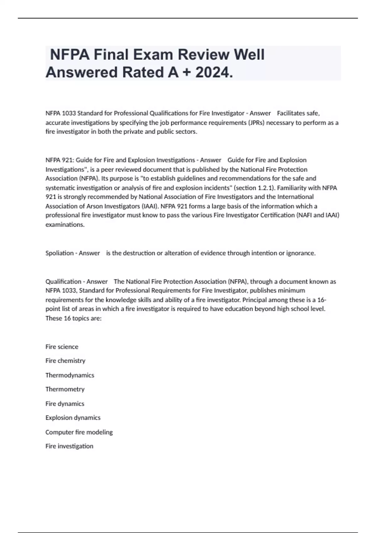 1 Exam (elaborations) Arson and investigations Pro study guide Exam And Complete Updated Answers 2024. 2 Exam (elaborations) Certified Fire Investigator Exam With Complete Solutions 2024. 3 Exam (elaborations) CFEI Definitions Test Quizzes And Answers Already Passed 2024. 4 Exam (elaborations) CFEI Study Guide Exam Questions And Correct Updated