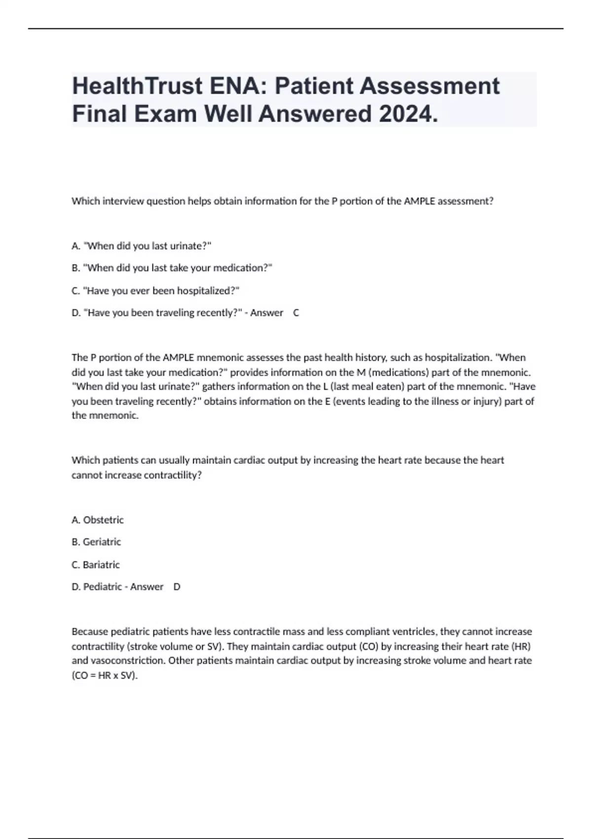 HealthTrust ENA Patient Assessment Final Exam Well Answered 2024.