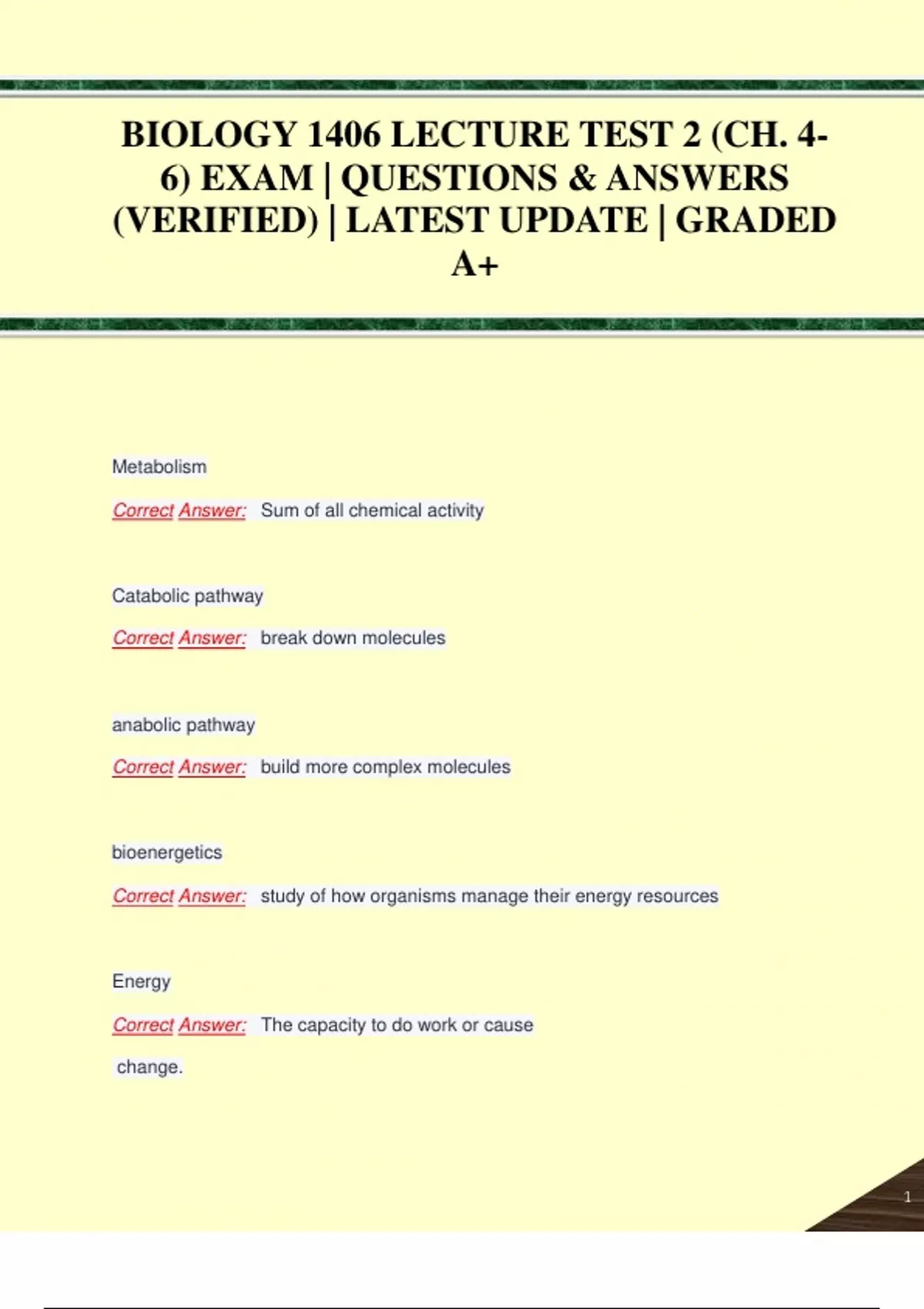 BIOLOGY 1406 EXAMS PACK | QUESTIONS & ANSWERS (VERIFIED) | LATEST UPDATE | GRADED A+