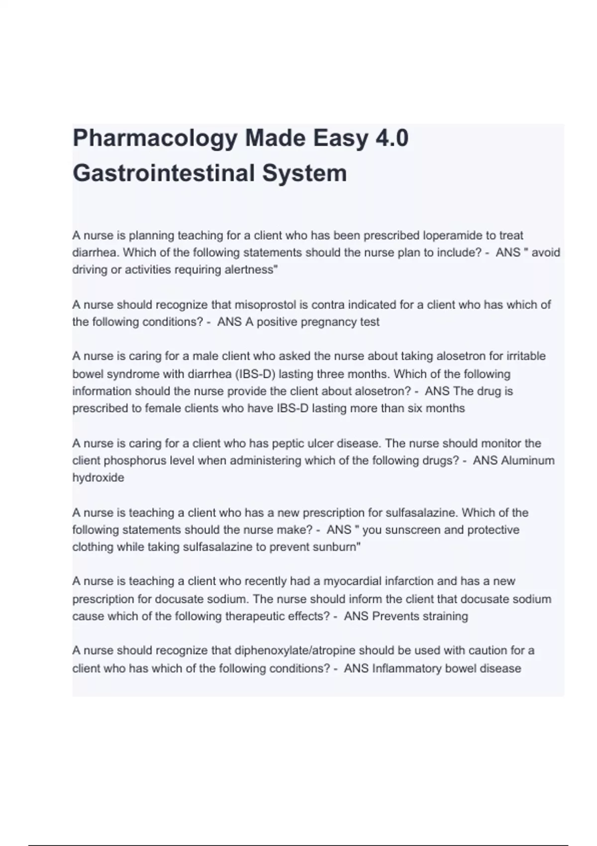 ATI Gastrointestinal System-Pharmacology Test Exam Questions and Answers (A+ GRADED)
