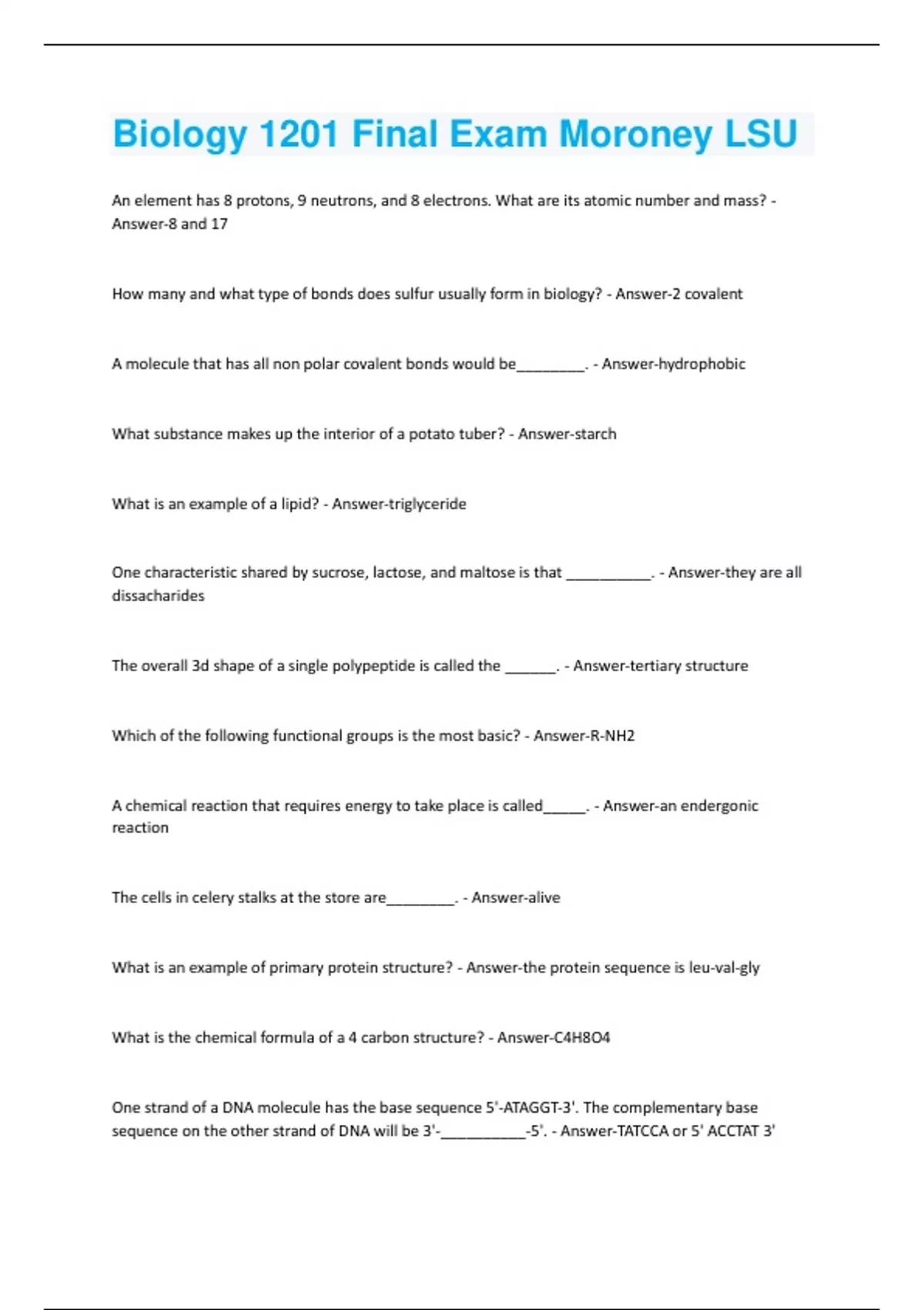 Biology 1201 Final Exam Moroney LSU exam Already Passed!!