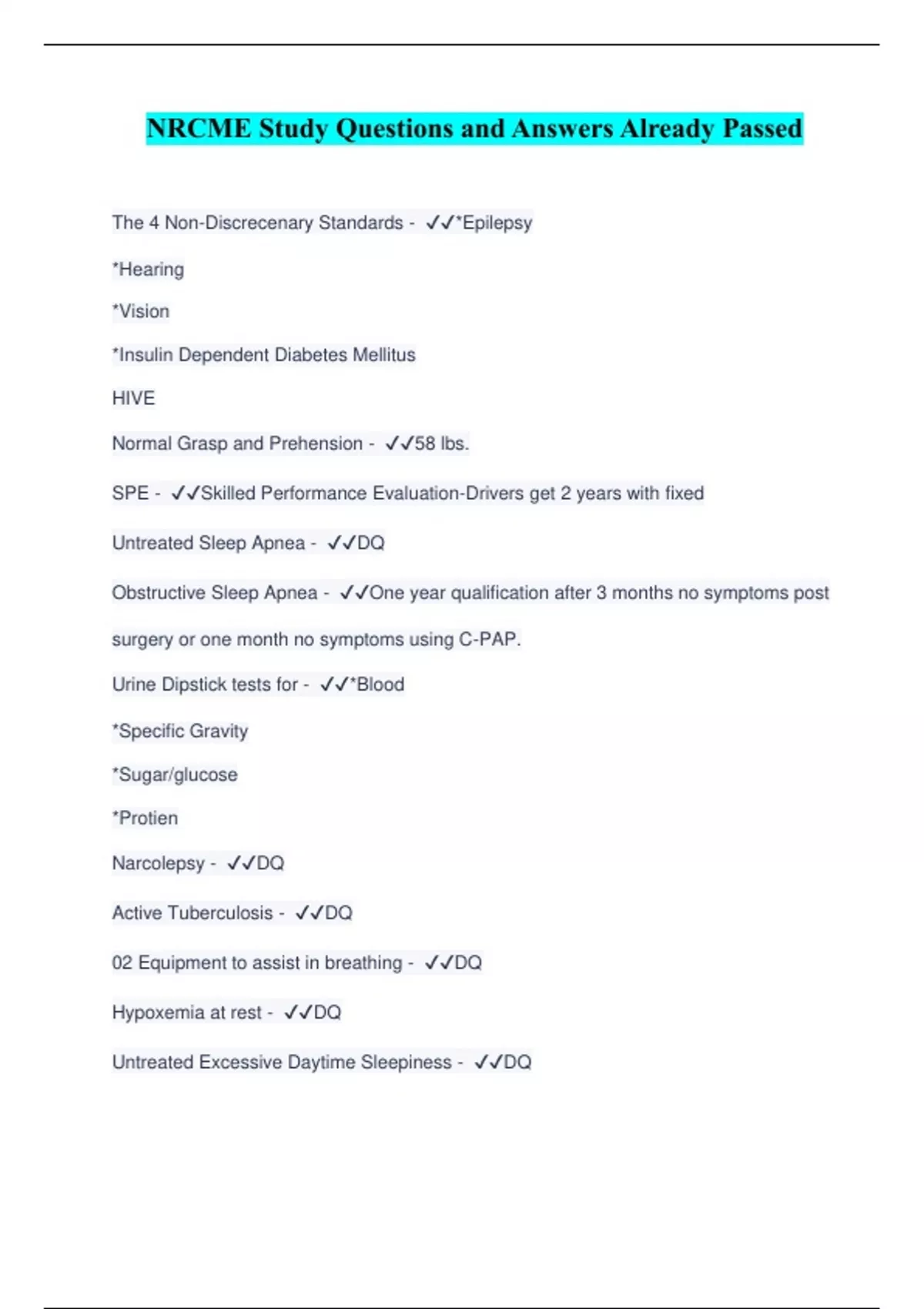 DOT exam - NRCME Training Institute Material Pretest review | 100% Correct Answers | Verified | Latest 2024 Version