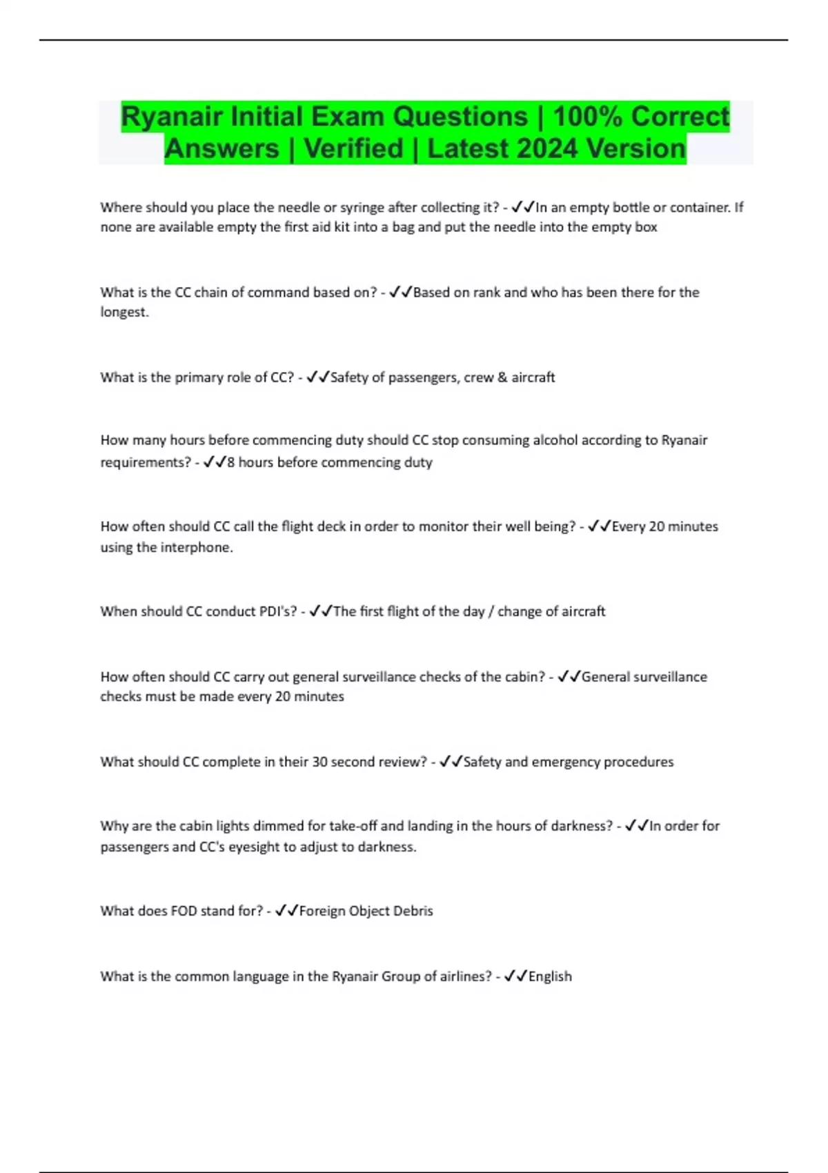 Ryanair Initial Exam Questions | 100% Correct Answers | Verified | Latest 2024 Version