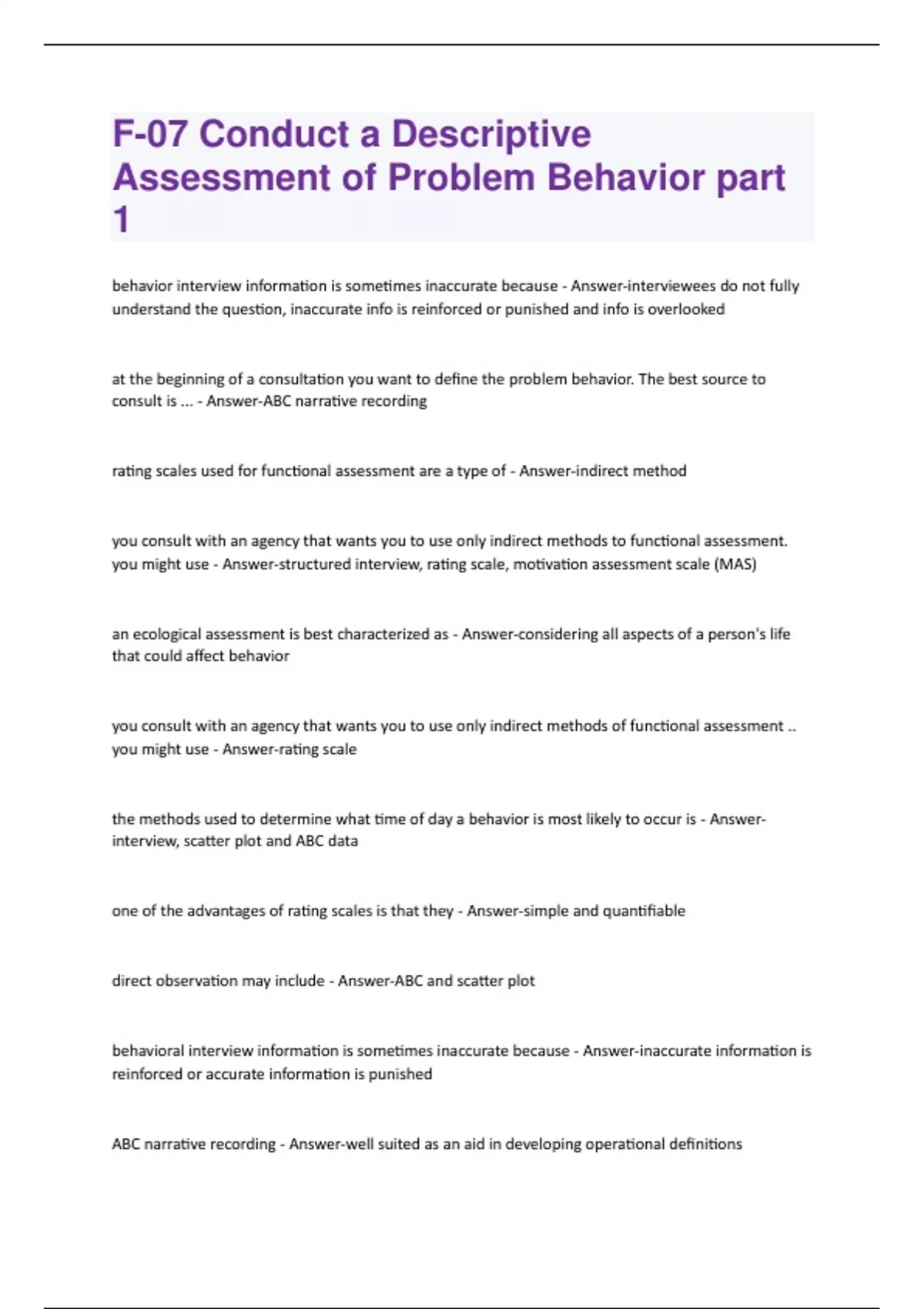 F-07 Conduct a Descriptive Assessment of Problem Behavior part 1 Questions and Answers with complete