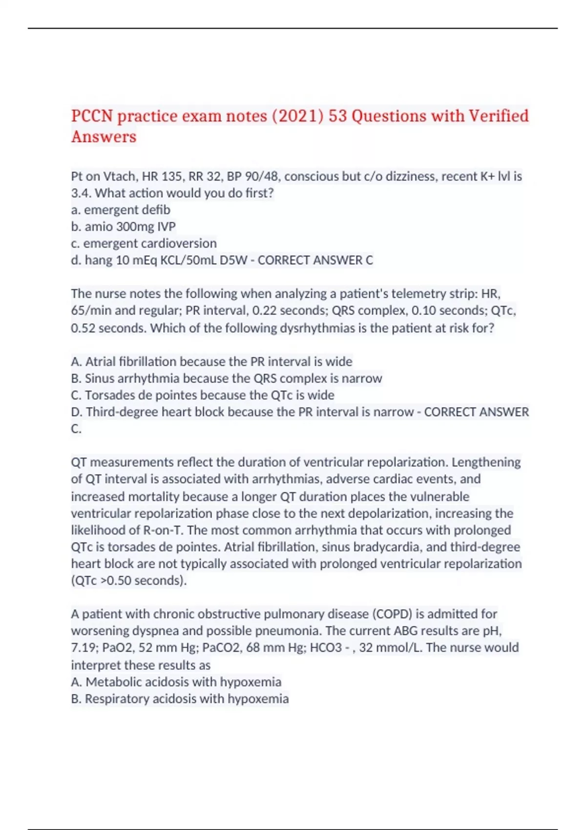 PCCN Exam 120 Questions with Verified Answers,PCCN practice exam notes (2021) 53 Questions with Verified Answers,PCCN Exam 200 Questions with Verified Answers,Adult CCRN/PCCN Certification practice Test 50 Questions with Verified Answers,PCCN Exam 132 Questions with Verified Answers,PCCN Review Cardiac Exam Questions with Verified Answers,
