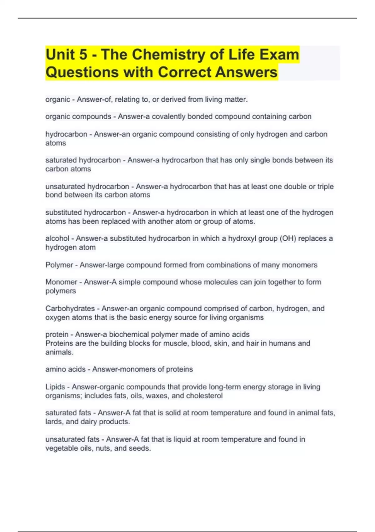 Exam (elaborations) Chemistry of Life-CK12 Exam Questions with Verified Answers Exam (elaborations) Chemistry of Life Test Review Exam Questions with Correct Answers Exam (elaborations) Chemistry Of Life (Organic Chemistry) Exam Questions with Complete Solutions Exam (elaborations) Chapter 25 The Chemistry of Life Organic and Biological Chem