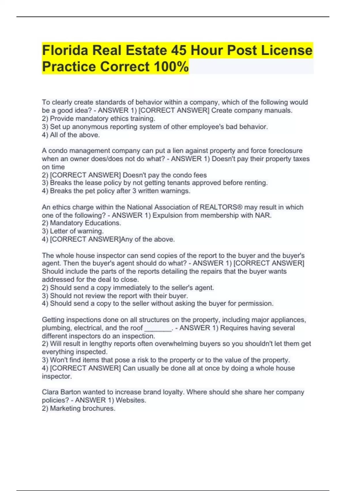 Florida Real Estate 45 Hour Post License EXAM PACK!!