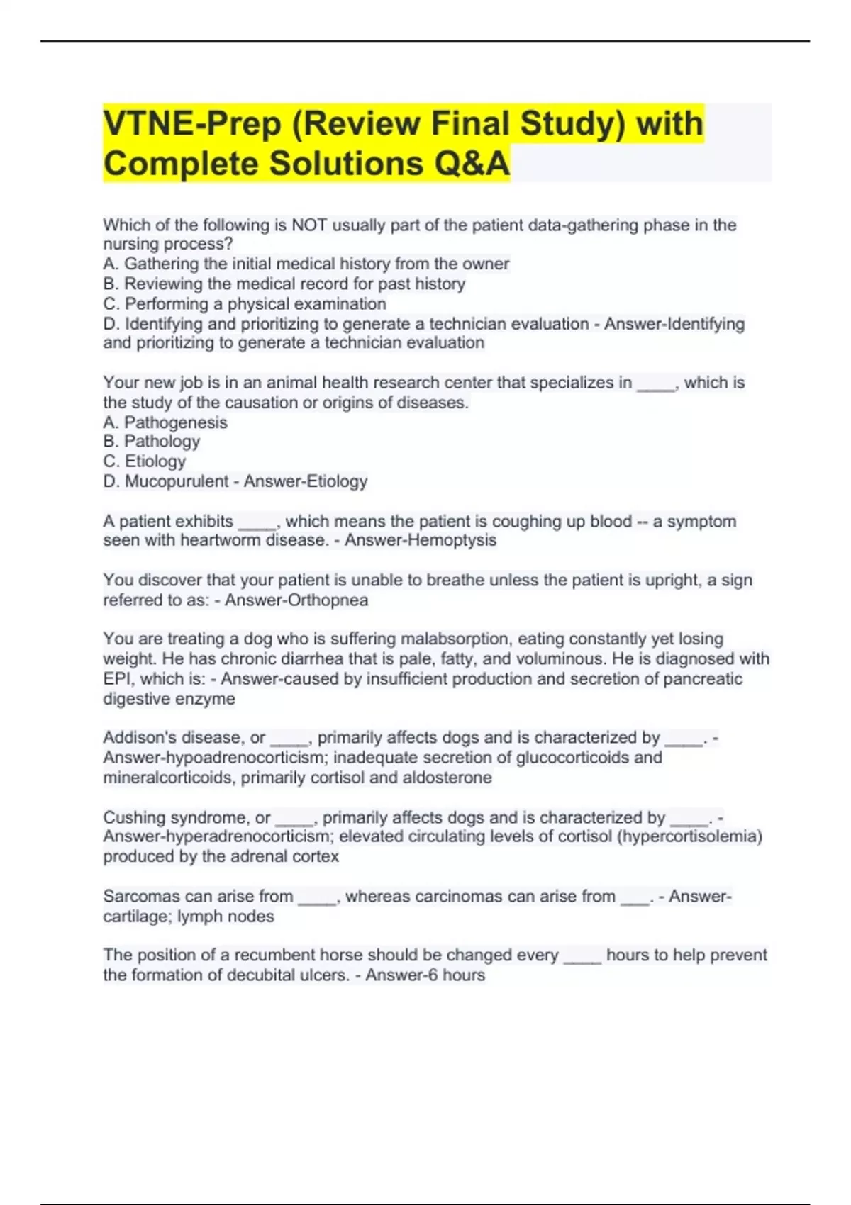 VTNE-Prep (Review Final Study) with Complete Solutions Q&A