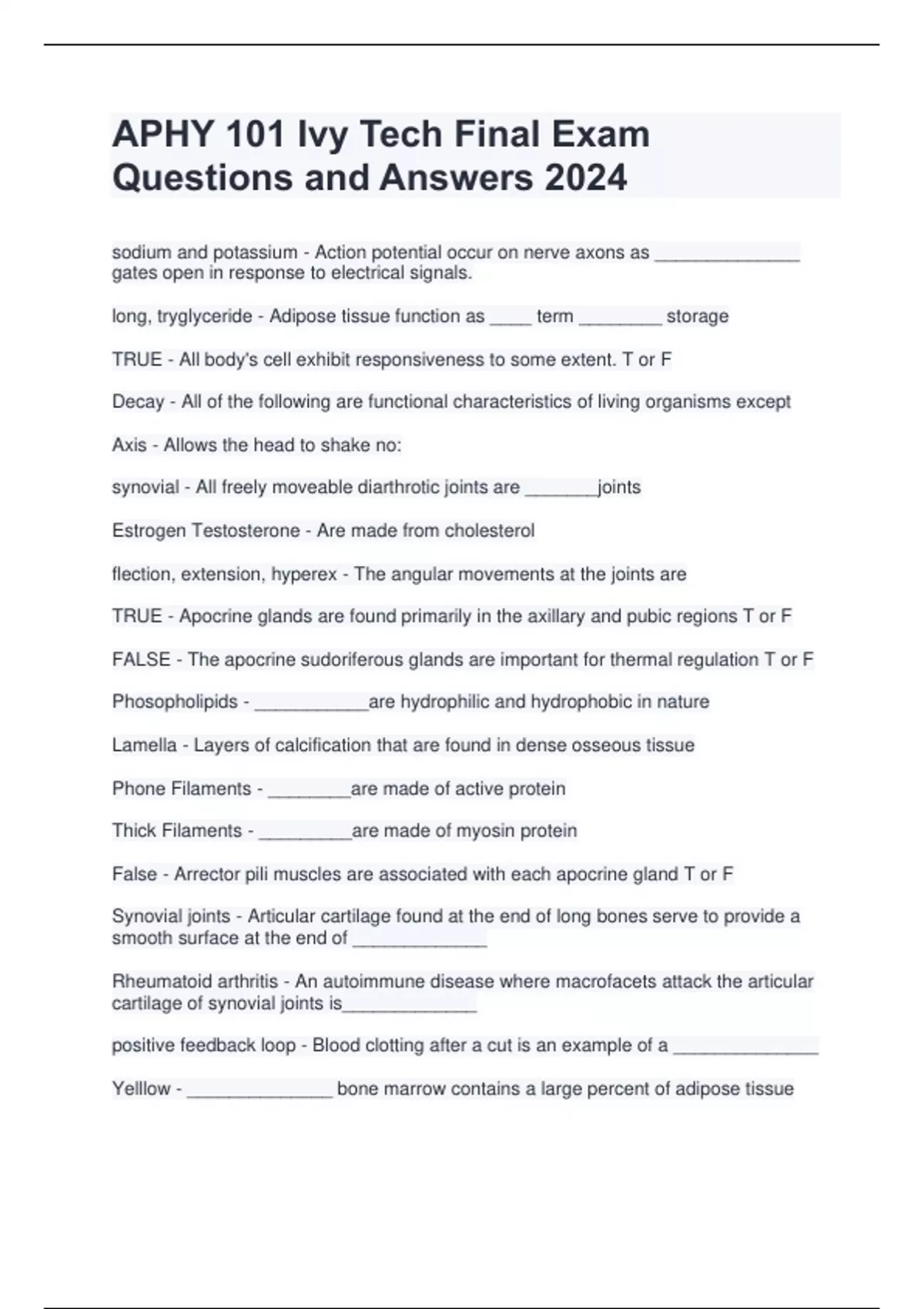 PACKAGE DEAL FOR APHY 101 Ivy Tech Final Exam Questions and Answers 2024