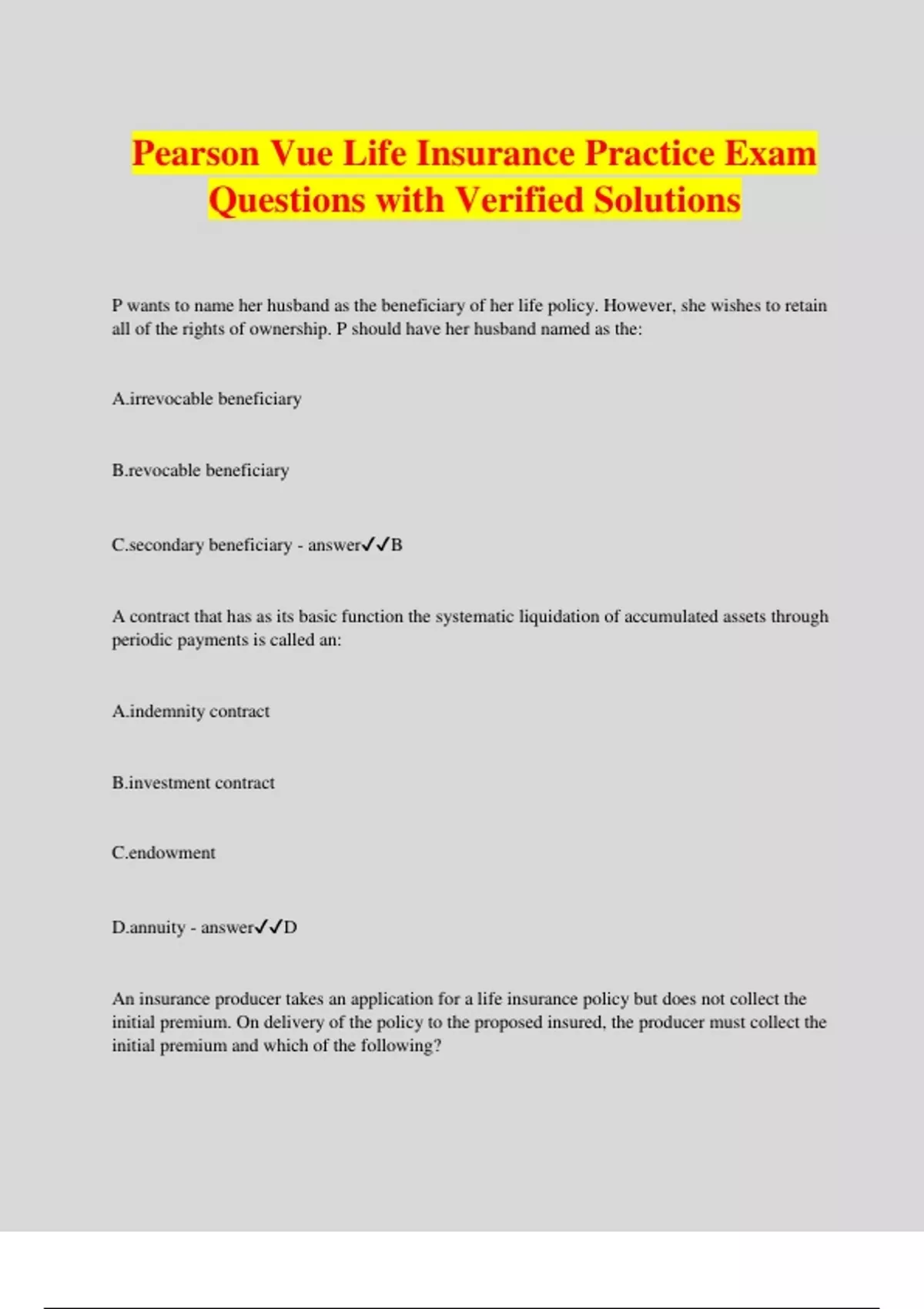 Pearson Vue Life Insurance Practice Exam Questions And Answers 100% Solved